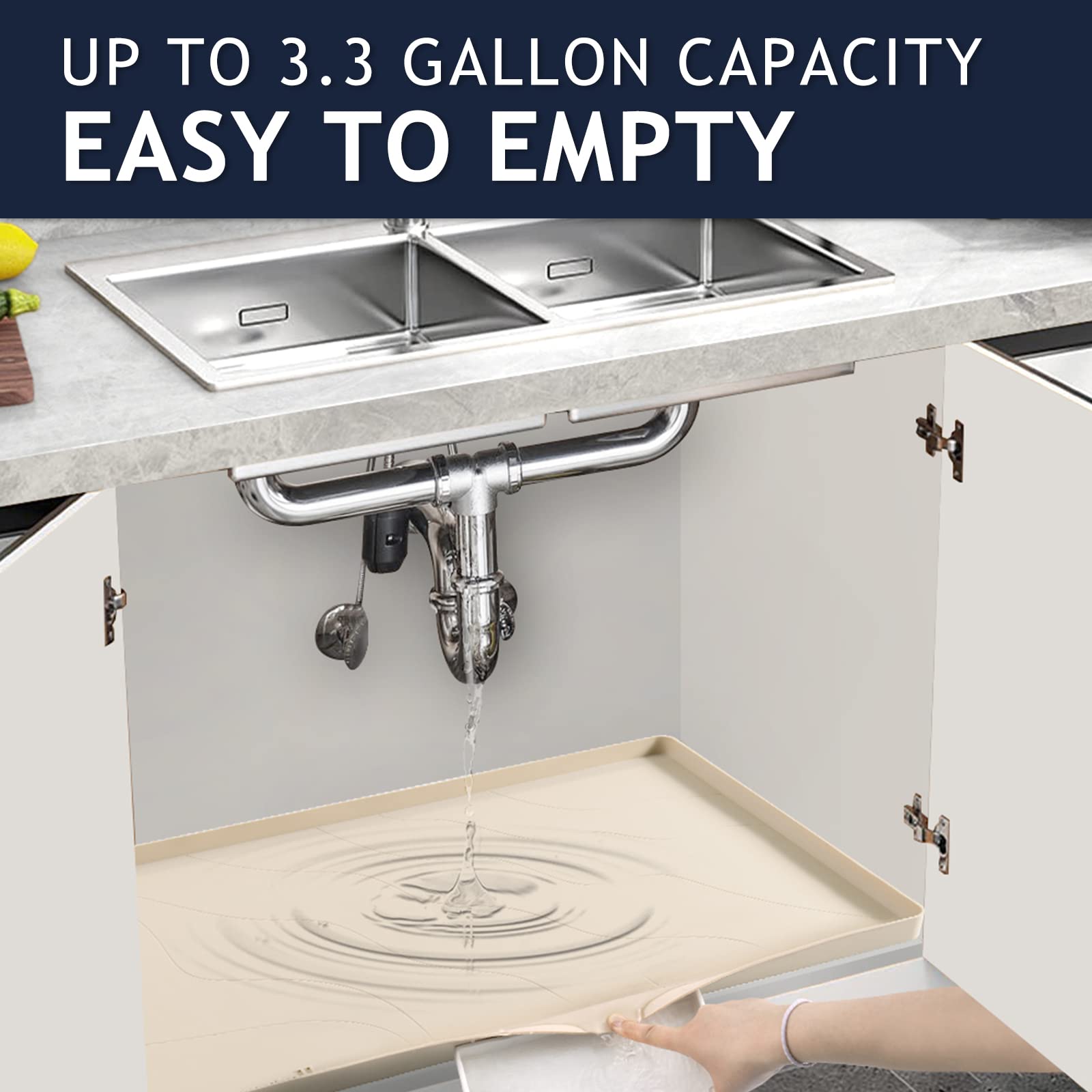 - {Anti Slip Wave Pattern Surface&1''High Edge,Sturdy Construction}----Silicone under sink tray is designed with an modern wave pattern nonslip smooth surface,perfectly cover up your current damaged cabinet floor ,functional as well as very visually appealing! Good grip rubber helpful to keep your pots and pans neatly stay in place .1'' extra high lips hold up to 2.5 gallons of water, extremly firm to prevent leakage from spreading while giving you more time to address a leak.