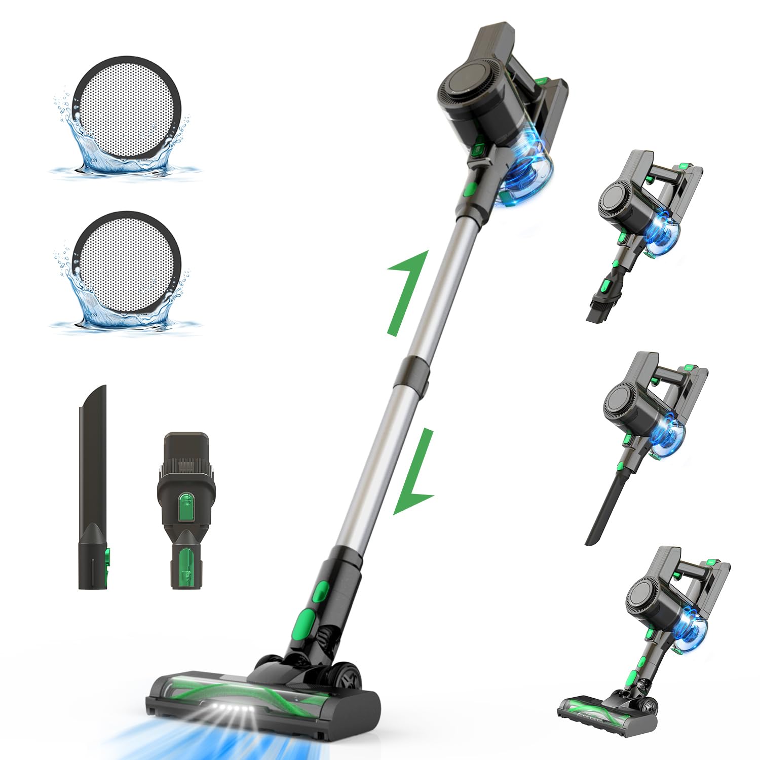 - 【Lightweight Design and Multifunctional】This lightweight cordless stick vacuum weigh only 3.2 lbs for long time use and won't deal with fatigue.The floor brush head with 2 LED headlights helps track dirt in dark and hard-to-reach places. swivels 180° sideways and 90° up and down flexible and movable.It comes with multiple accessory(sofa brush/ 2-in-1 cervice tool) fittings and a retractable tube that can be assembled into a multifunctional handheld vacuum cleaner that can deep clean curtains, beds, sofas car seats.and any dead space.