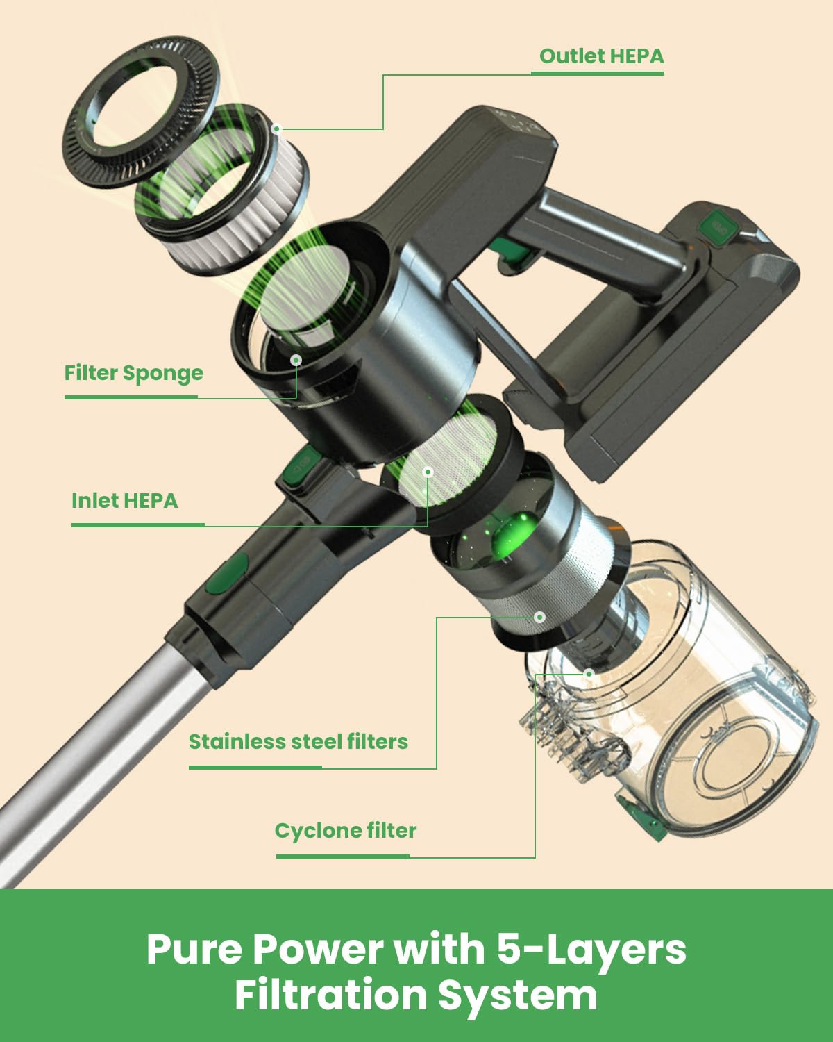 - 【Advanced Filtration System】the wireless vacuum cleaner incorporates a 5-layer HEPA filtration system, capturing up to 99.99% of particles as small as 0.3 microns. The sealed cyclone filtration prevents secondary air pollution, ensuring a cleaner, healthier home environment. The HEPA filter is washable and reusable for long-lasting performance.