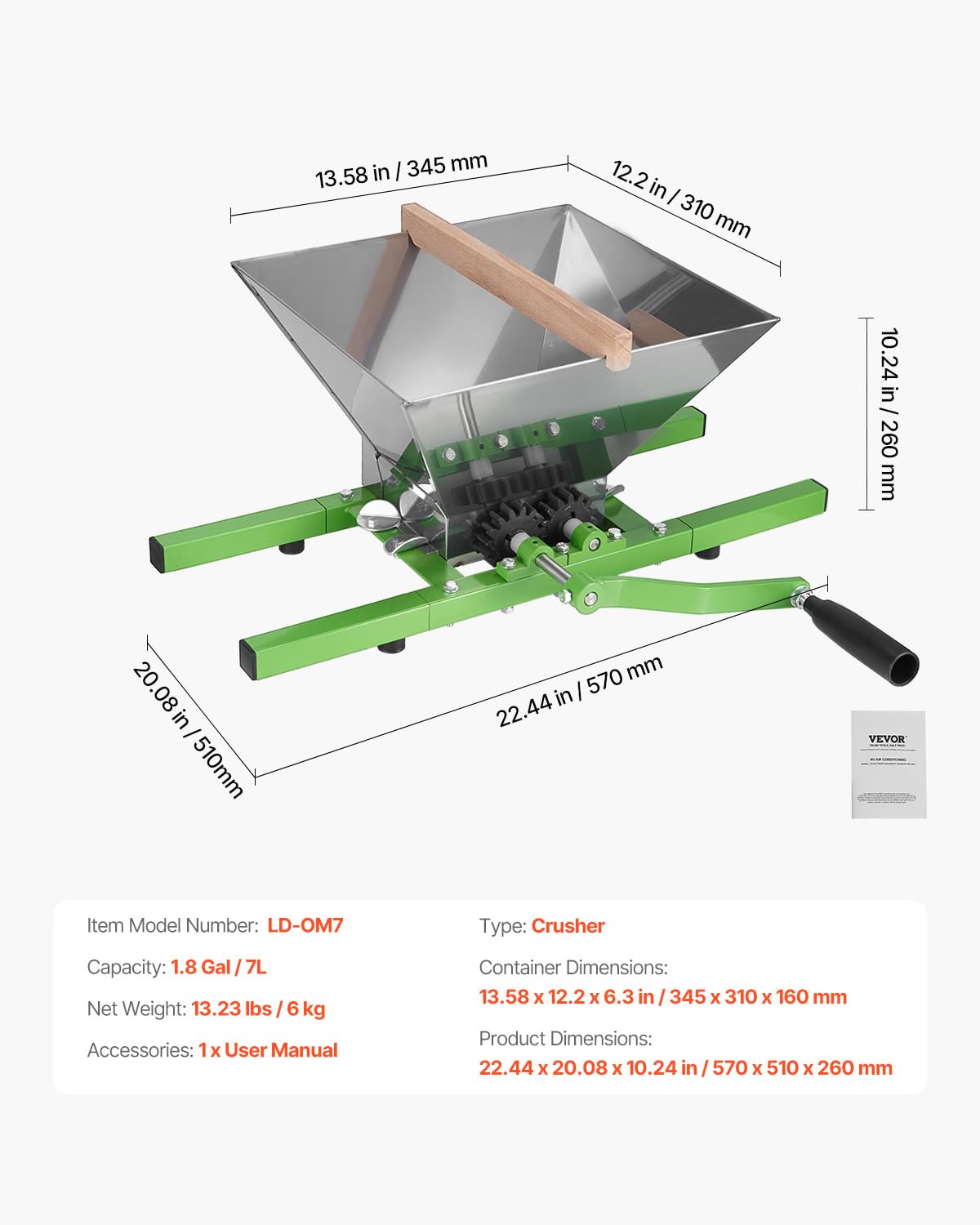 - Large Capacity & High Efficiency: This fruit and apple crusher features a 7L/1.8Gal capacity, designed for powerful performance and fast crushing speed, saving you significant time and effort