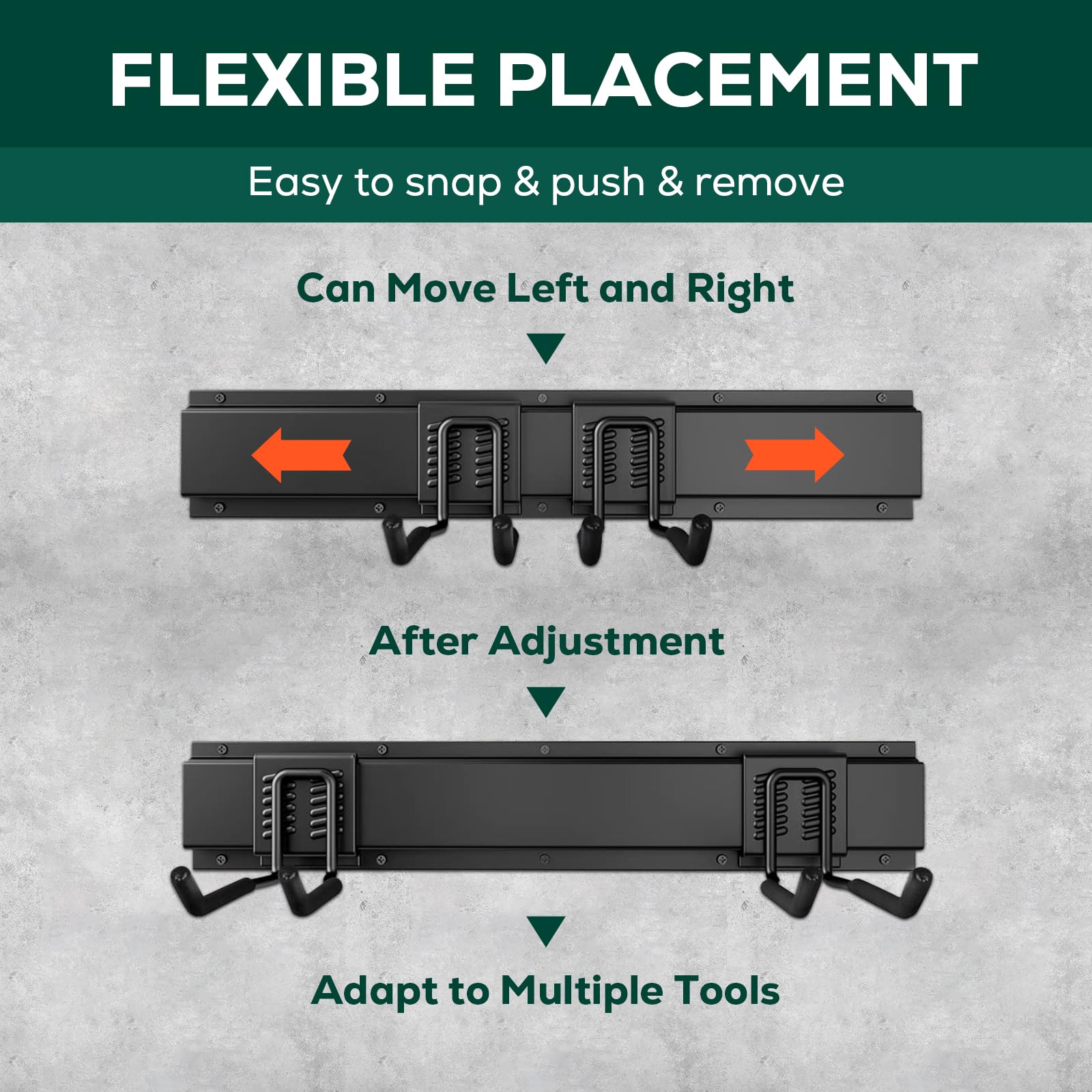 - 【Easy to Install Garage Tool Hanger】Our Garage Tool Organizer is designed for hassle-free installation, allowing you to have a fully functional tool wall within minutes. With clear and concise instructions, setting it up is a straightforward process. The hooks on the rack can be easily moved along the tracks, giving you the freedom to customize your storage according to your changing needs.
