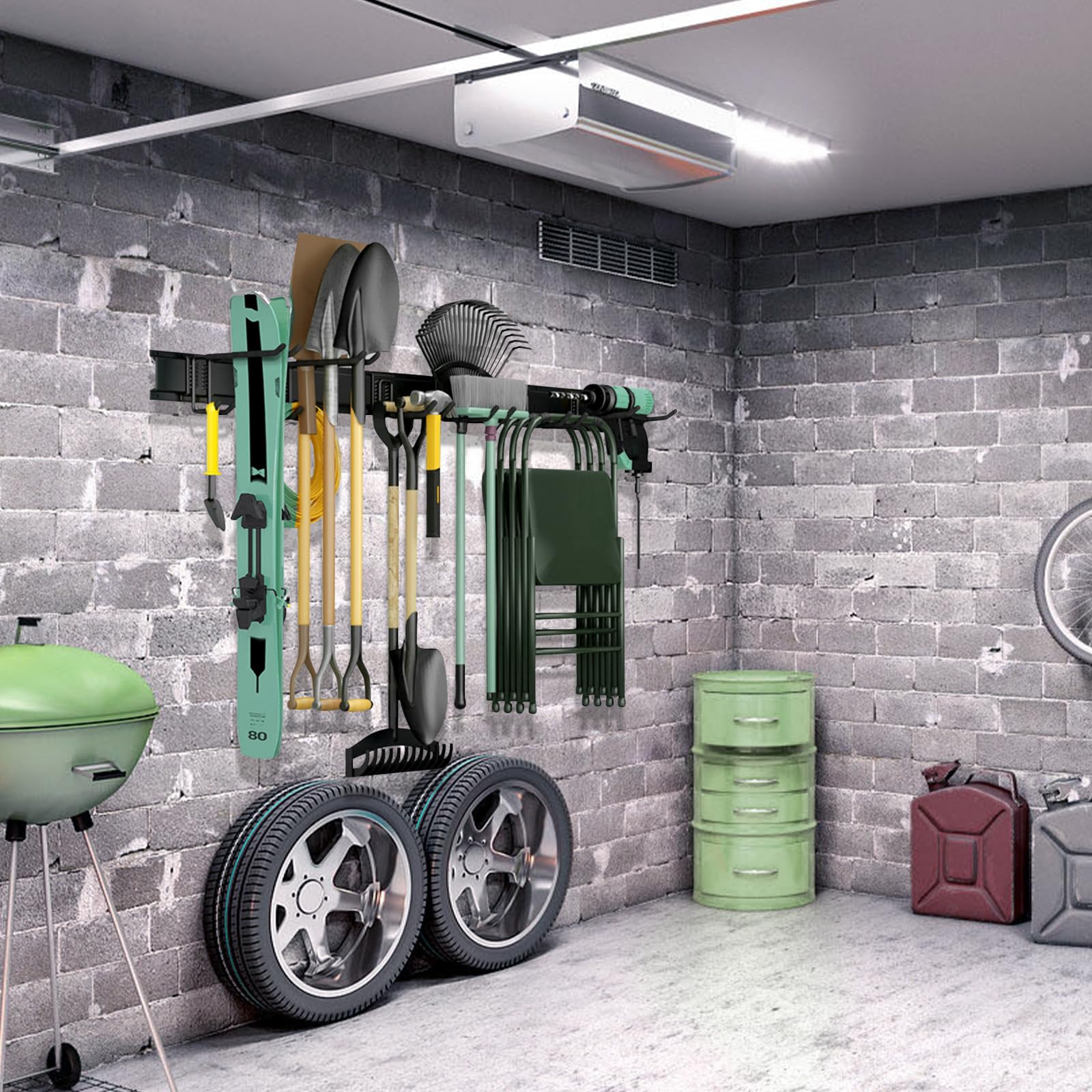 - 【Multi-function Garage Tool Organizer】The wall-mounted organizer for your garage offers exceptional organization solutions for your home, garage, store, or cellar. It is perfect for hanging and organizing various items such as garden tools, shovels, rakes, brooms, mops, extension cords, hoses, power tools, and even sporting equipment like helmets, boots, ice skates, hockey sticks, ski gear, and more.