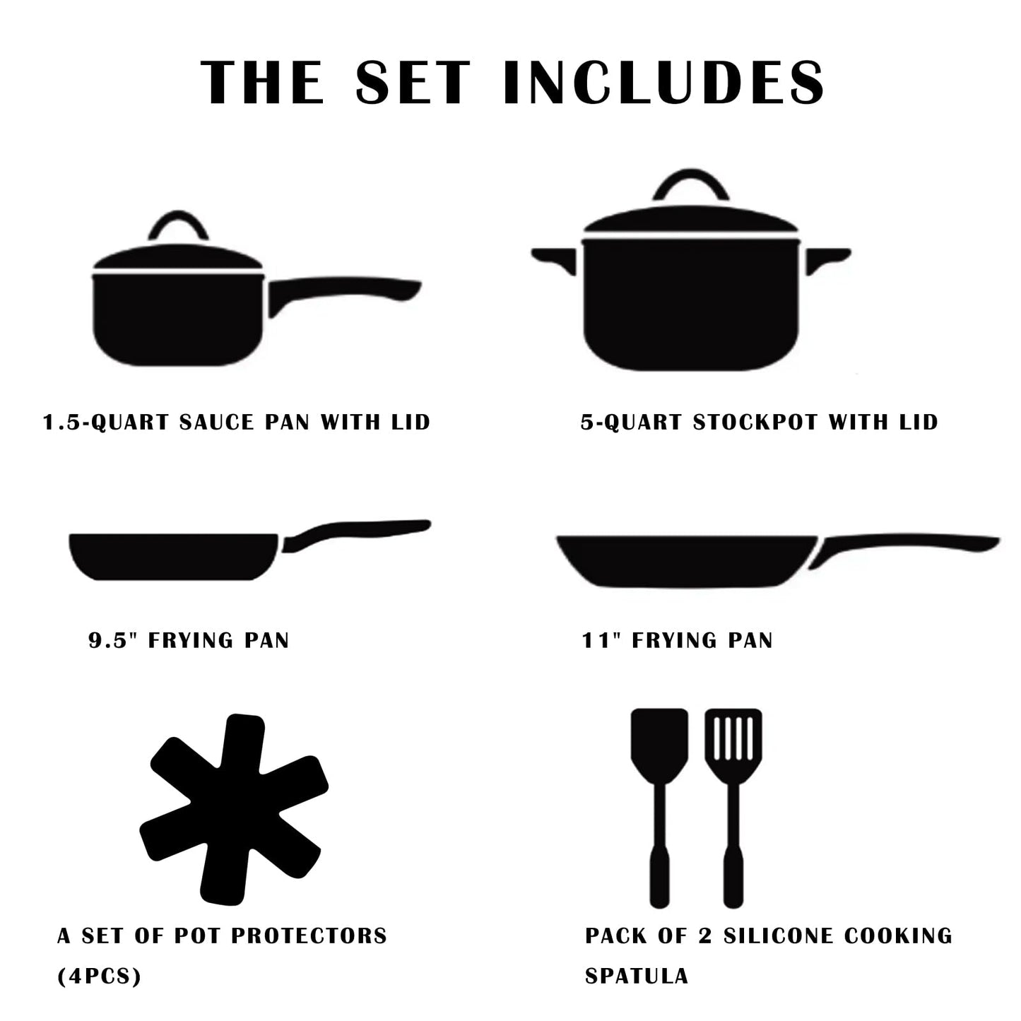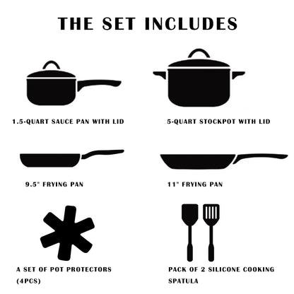- Enjoy a tasty and safe cooking experience with the Vkoocy Series Set! This 12-piece cookware set includes a 9.5" frying pan, 11" frying pan, 1.5-quart sauce pan with Lid, 5-quart stockpot with Lid, pack of 2 Silicone Cooking Spatula, a set of pot protectors. This set contains all the tools you need to fry, sear, roast, and simmer your favorite dishes without worry. Plus, It's also specially decorated with patterns to make your kitchen blend with nature;