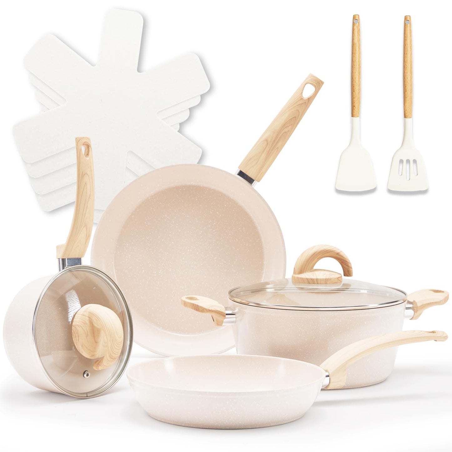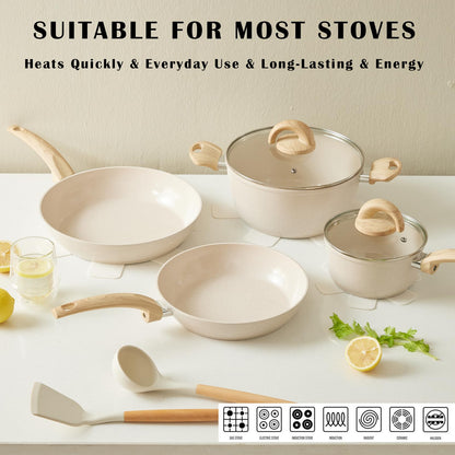 Vkoocy Non Stick Pots and Pans Set, Healthy Ceramic Cookware Set, 12pcs Kitchen Cooking Pots and Frying Sauce Saute Pans Set, PFAS-Free with Kitchen Utensils and Lid, Tan