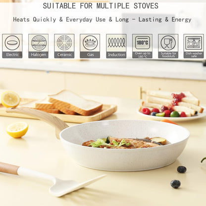- Healthier & Safe Cooking: The set features a ceramic nonstick coating made without PFAS, PFOA, PFOS & PTFE that allows for effortless food release and an even easier clean up. High magnetic conductive stainless steel base allows our non stick kitchen cookware to work on all cooktops, like Electric, Halogen, Ceramic, Gas, Induction, Glass and Oven. The Extended and Thicken Bottom Design also makes the cookware durable and heats up quickly and evenly;