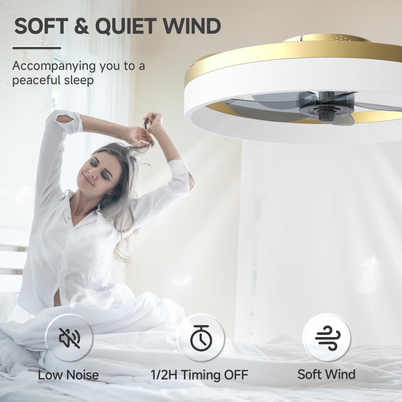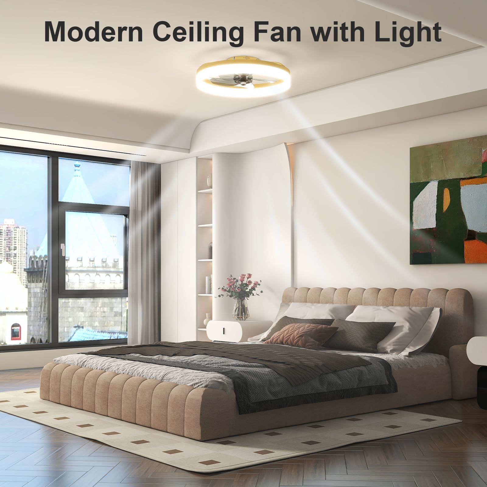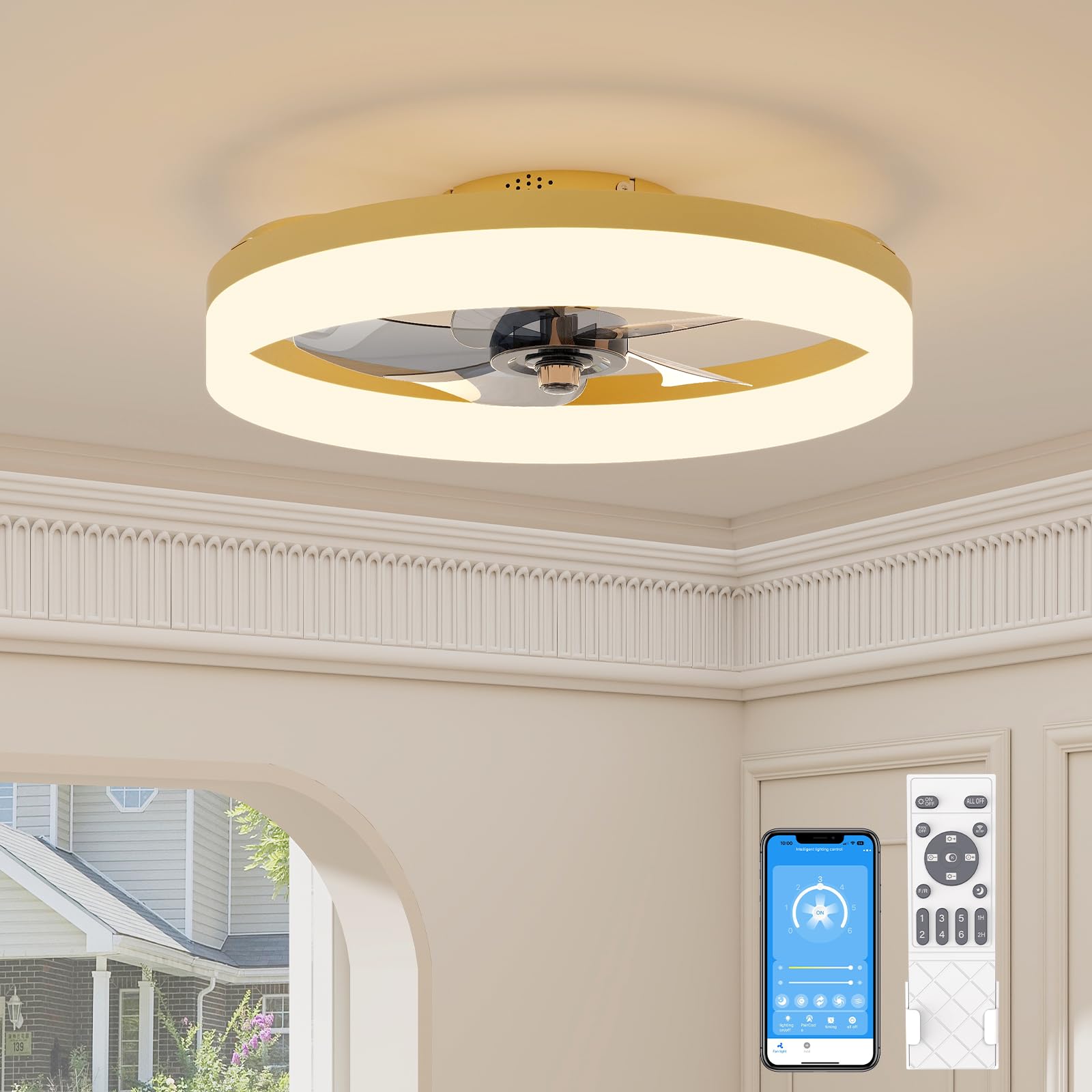 VOLISUN Low Profile Ceiling Fans with Lights and Remote, 19.7in Fandelier Ceiling Fan with Light, 3000K-6500K Dimmable Bladeless LED Fan Light, Gold Flush Mount Ceiling Fans with Lights for Bedroom
