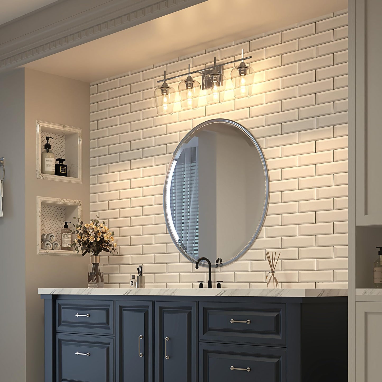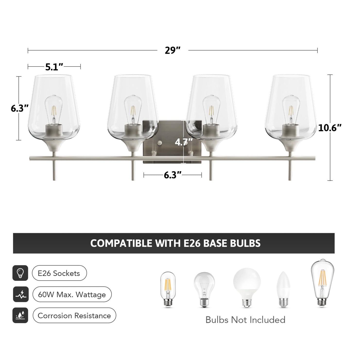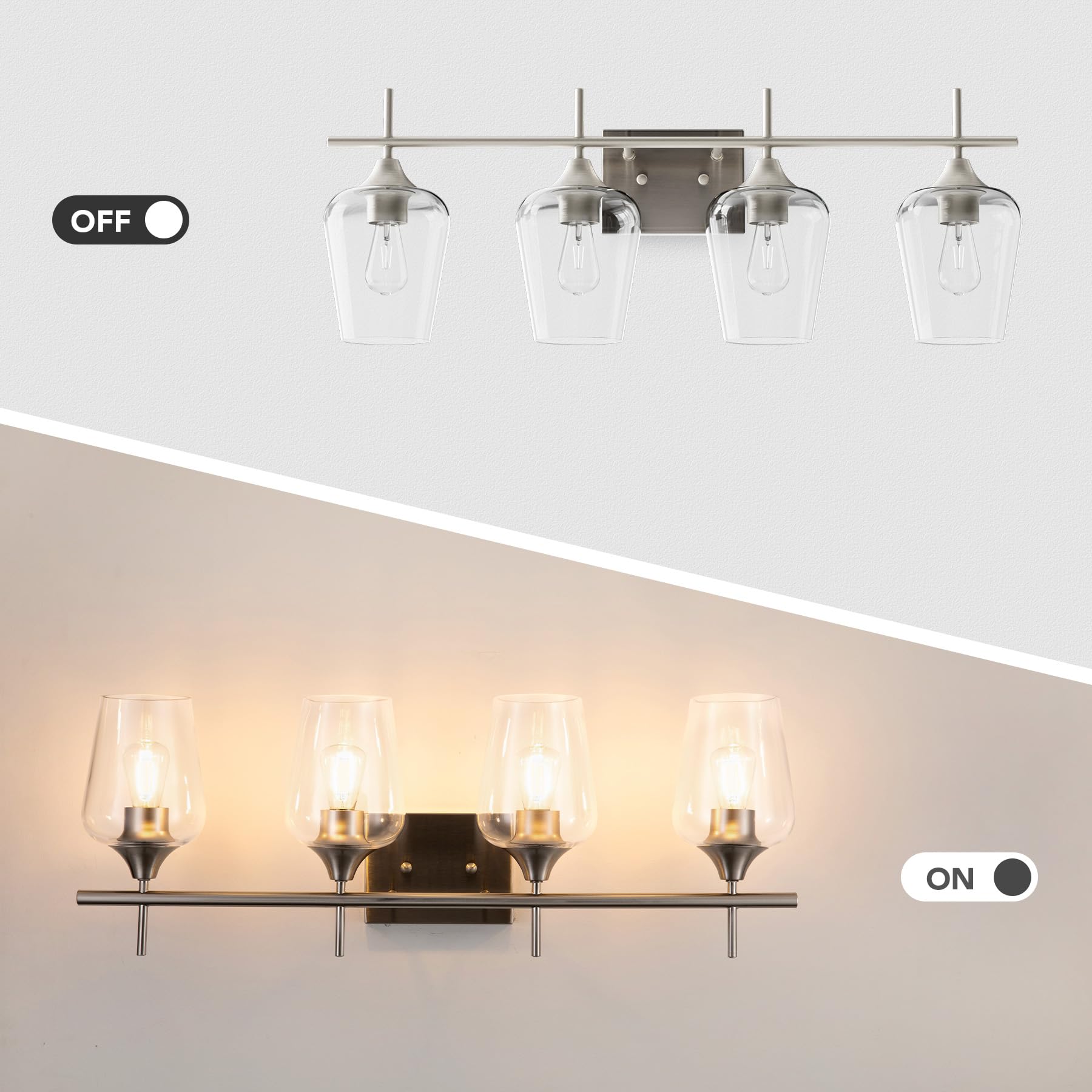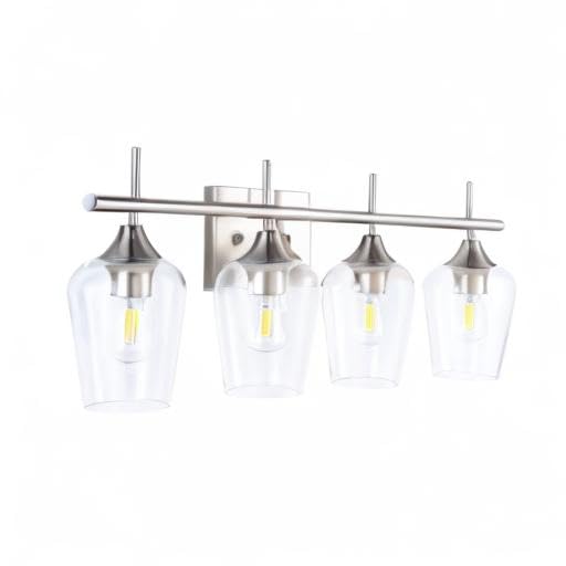 - Timeless Modern Design: This 4-light vanity light blends modern industrial style with minimalist elegance. Made with nickel-finish metal and clear glass shades, it adds a sleek, contemporary touch to enhance any room’s aesthetic