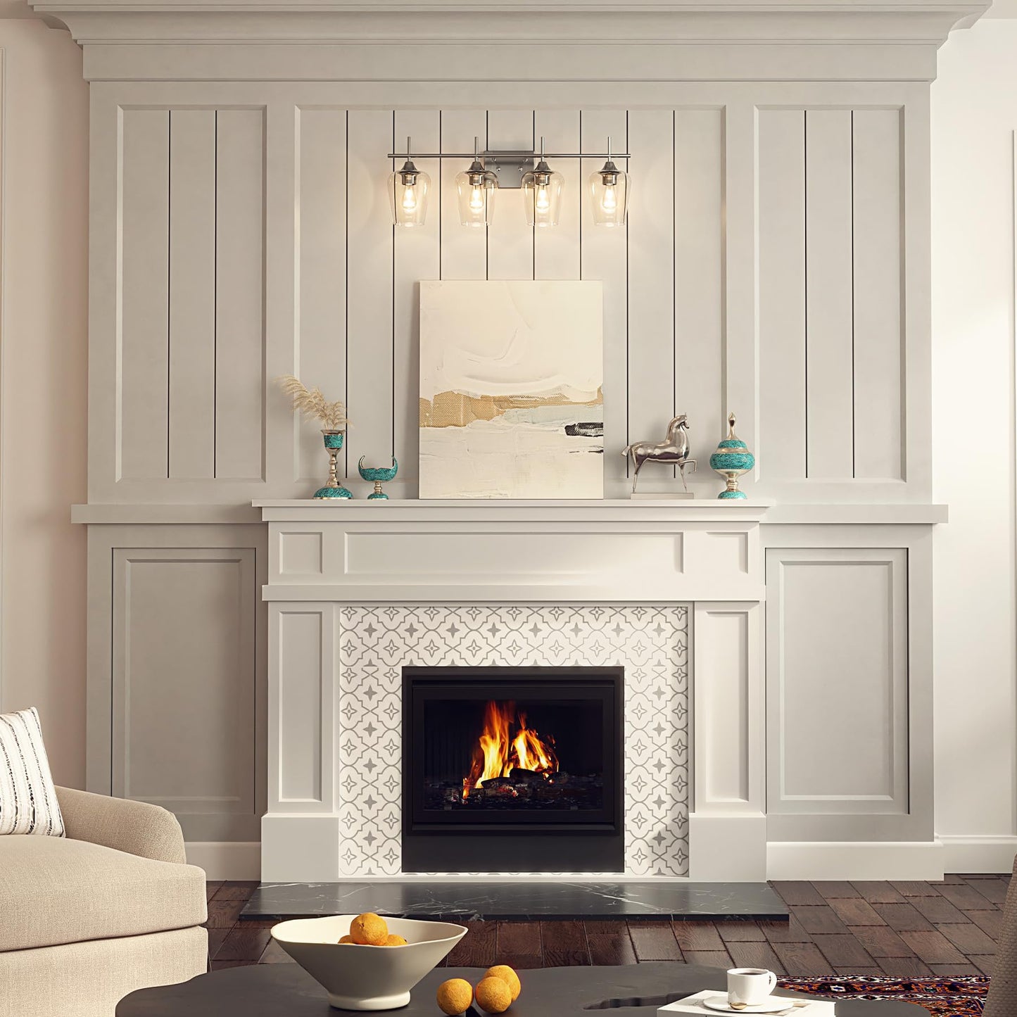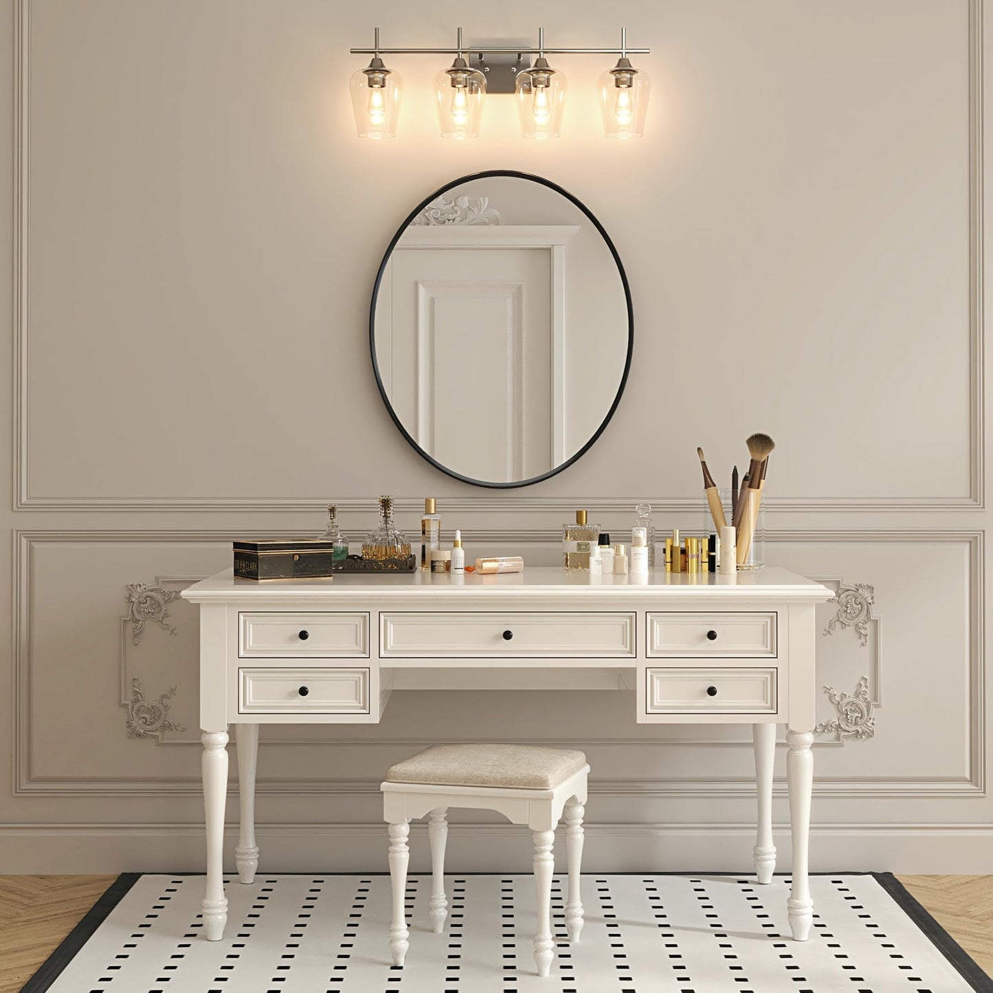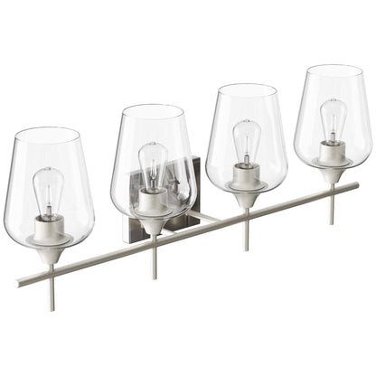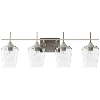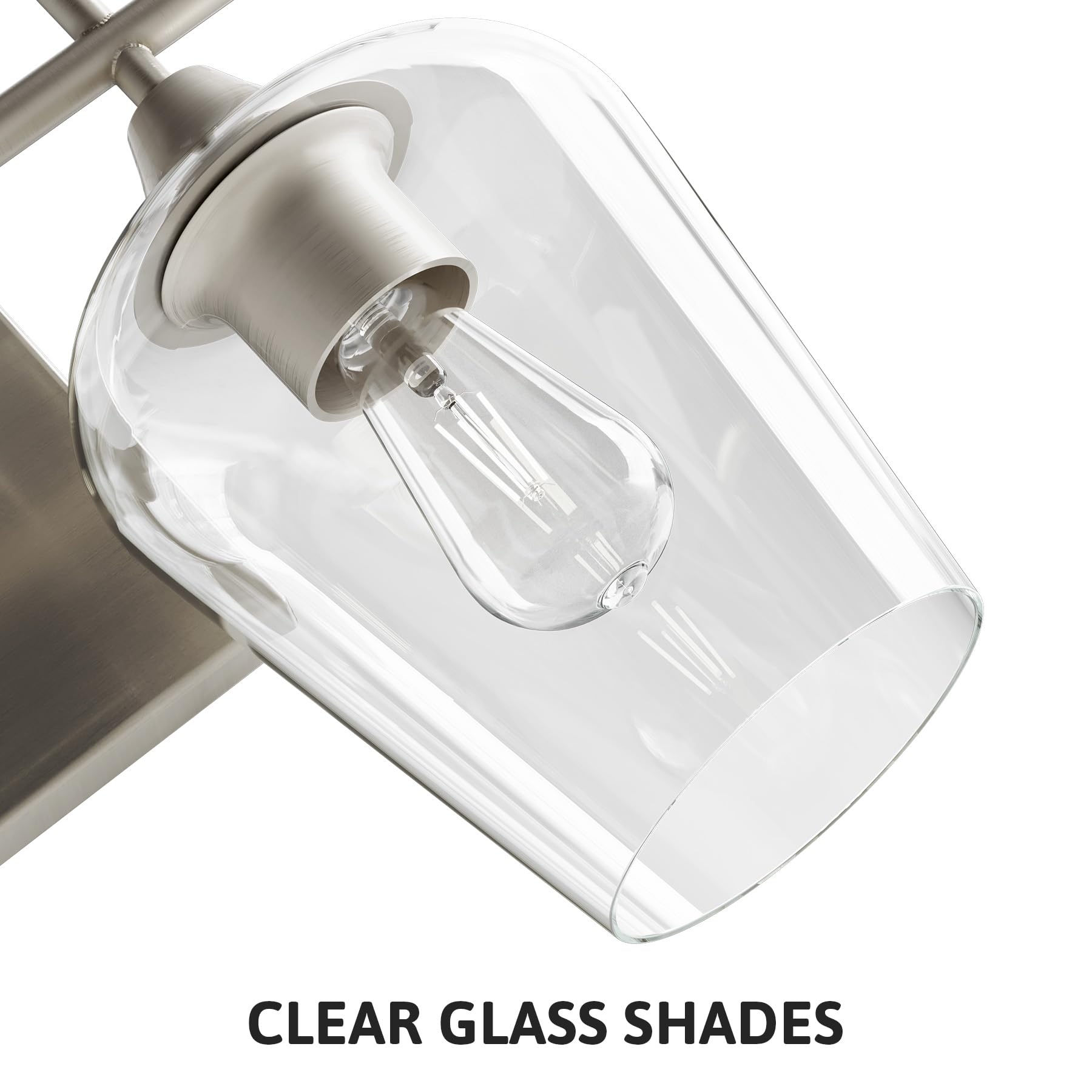 - Timeless Modern Design: This 4-light vanity light blends modern industrial style with minimalist elegance. Made with nickel-finish metal and clear glass shades, it adds a sleek, contemporary touch to enhance any room’s aesthetic