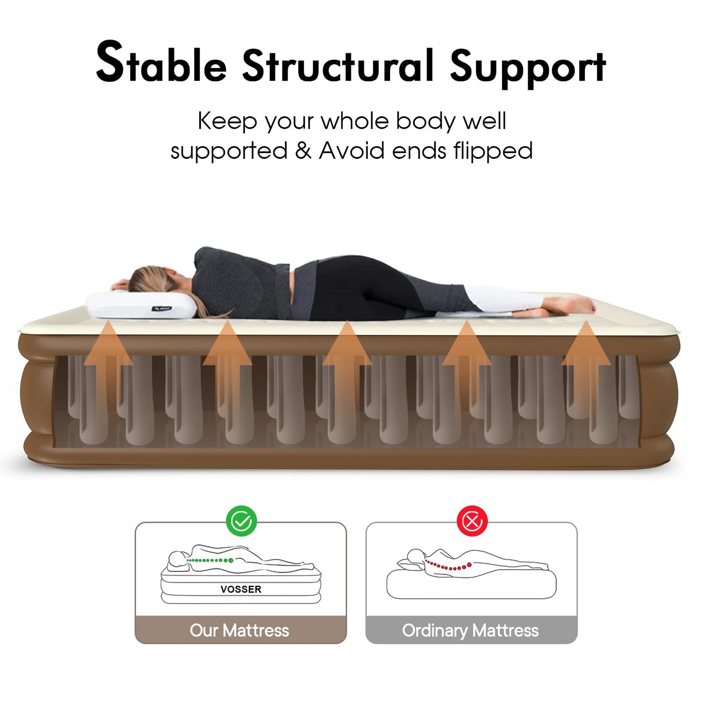 - 【Luxurious Comfort with Flocked Top】: The VOSSER air mattress features an upgraded, velvety flocked top, enhancing comfort with its softness and ease of maintenance due to its waterproof qualities, ensuring a clean sleeping environment. The indented sides of our inflatable mattress hold fitted sheets perfectly in place, ensuring a smooth and uninterrupted sleep