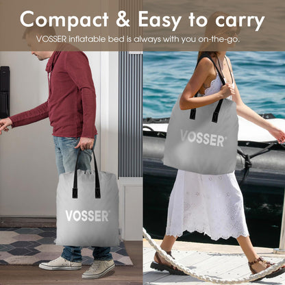 - 【Quick and Easy Setup】: Equipped with a 110v pump, the VOSSER blow up mattress inflates and deflates within 3 minutes. It includes a carry bag, making it easy to travel with or store in tight spaces like closets and RVs