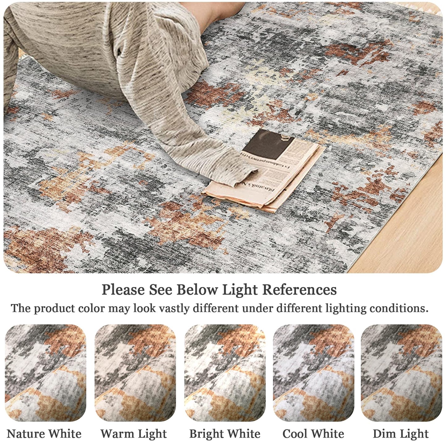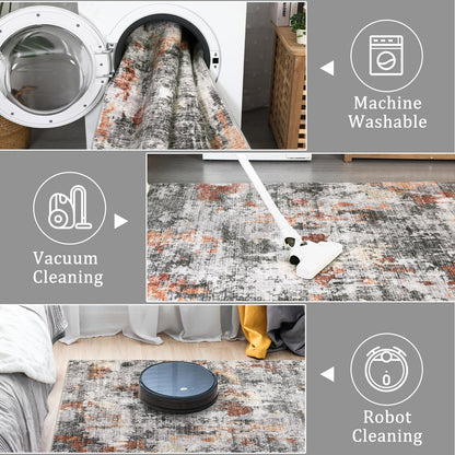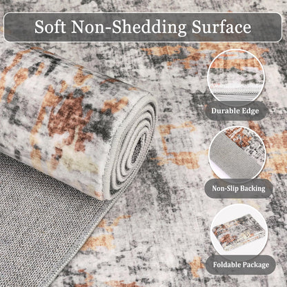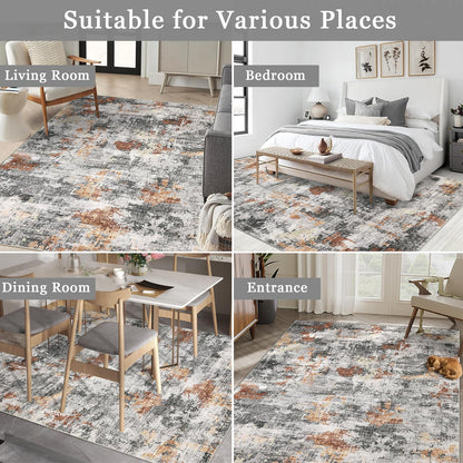 Washable Area Rugs for Living Room, 6x9 Soft Abstract Bedroom Rug Foldable Non-Slip Low Pile Area Rug Throw Carpet for Dining Room Home (Grey/Rust, 6'x9')