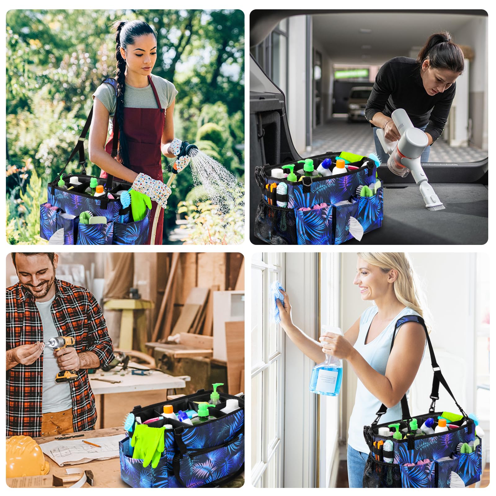 Wearable Cleaning Caddy Bag with Handle, Multi-functional Cleaning Supplies Caddy Organizer with Handle and Shoulder Strap for Car Wash, Gardening Tools, Painting/Picnic Items, Beach (Blue Leaves)