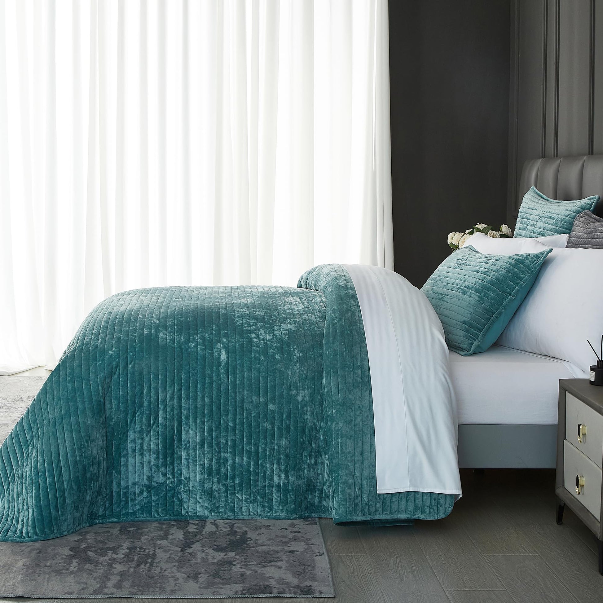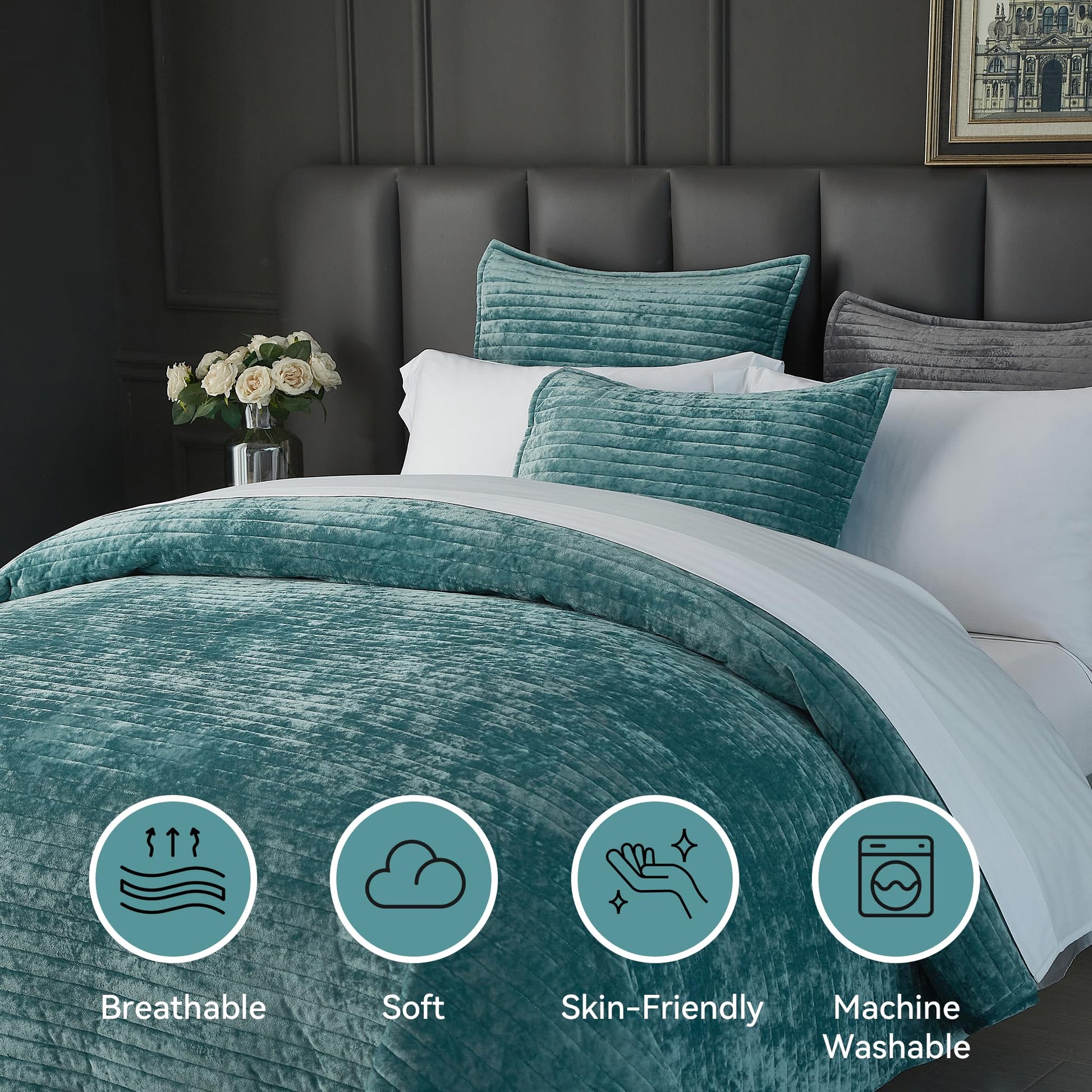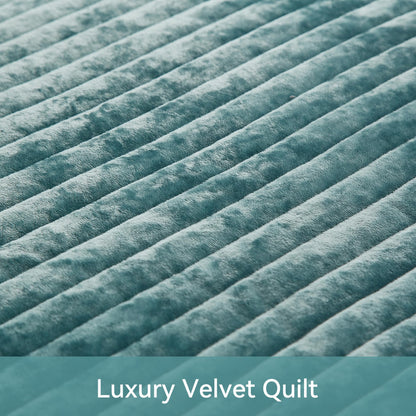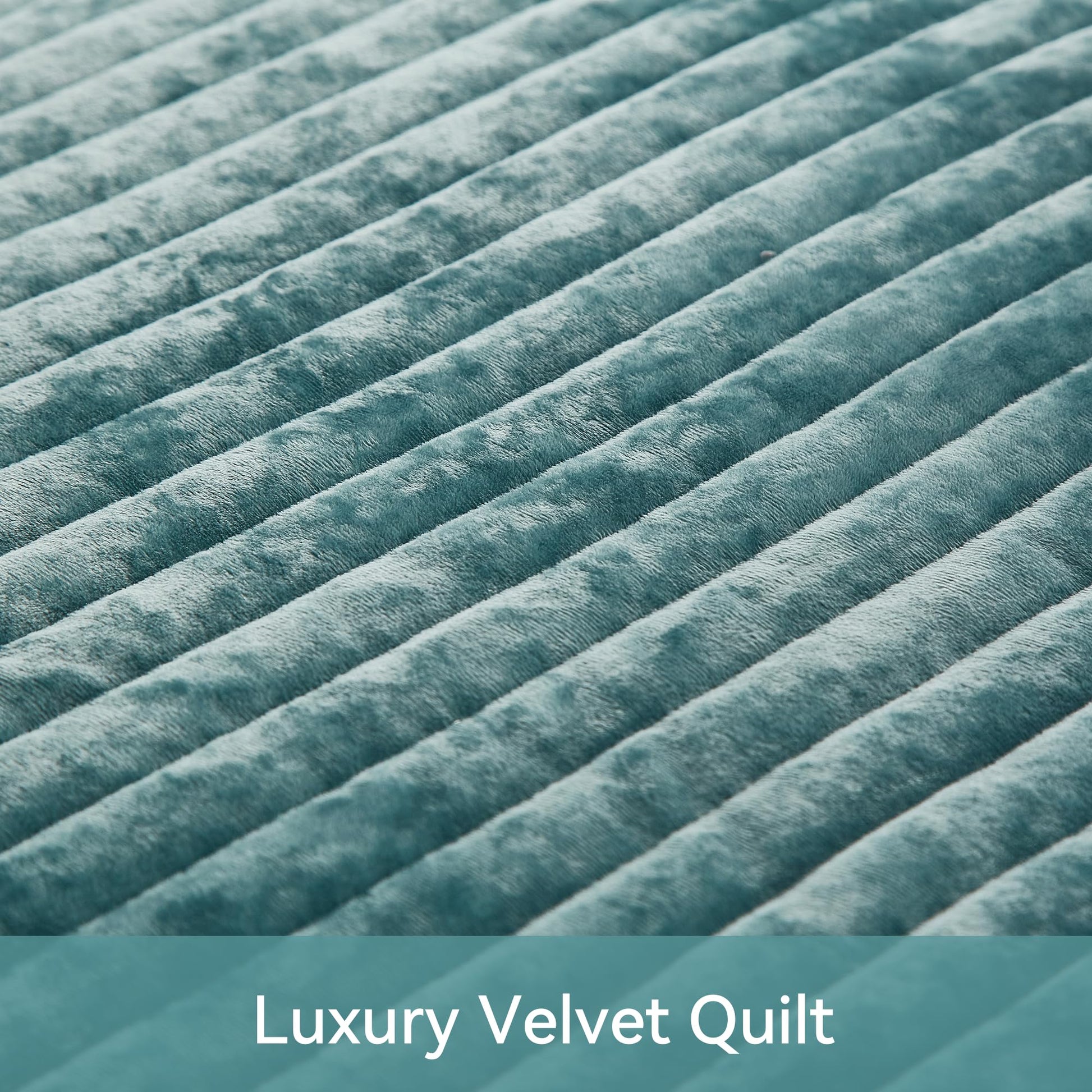 weigelia Velvet Quilts King Size Luxurious Soft Coverlet Striped Bedding Set Aqua Quilt with 2 Matching Pillowcases, for All Season