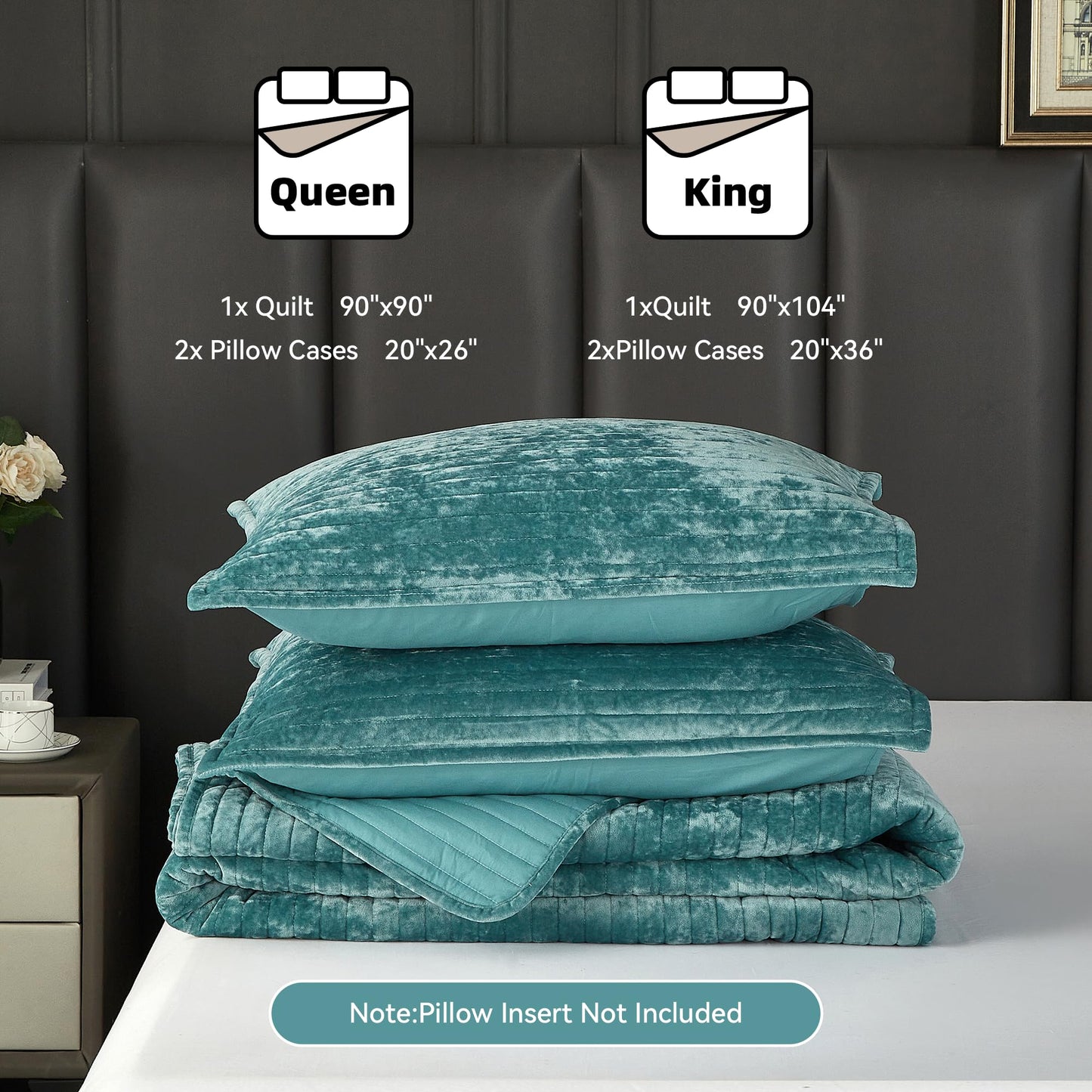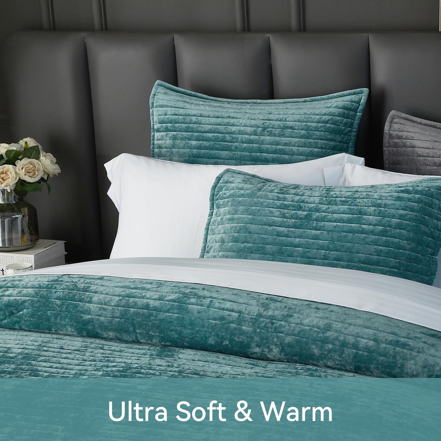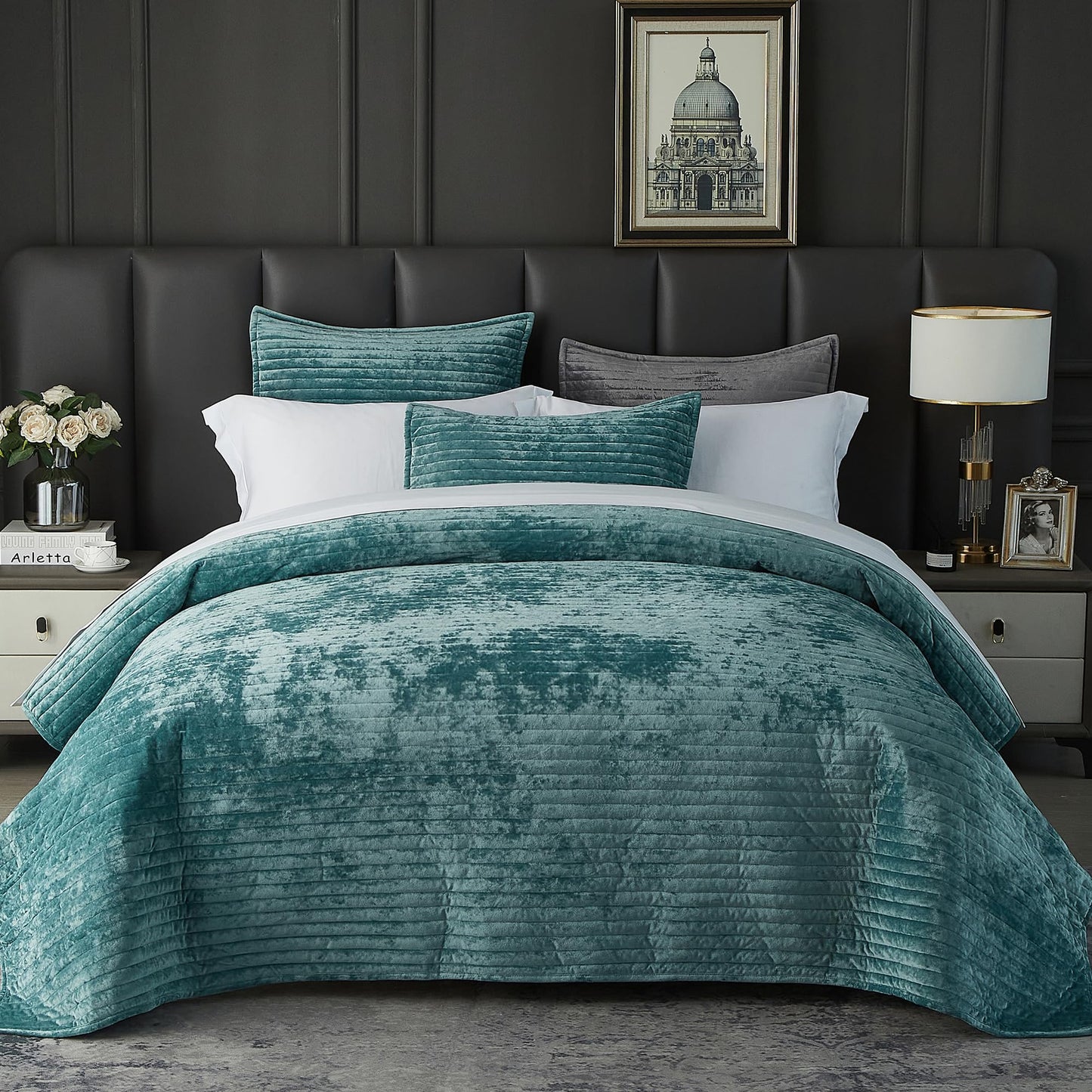 weigelia Velvet Quilts King Size Luxurious Soft Coverlet Striped Bedding Set Aqua Quilt with 2 Matching Pillowcases, for All Season