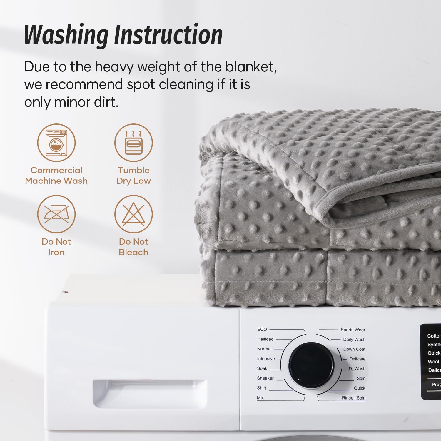 - Washing Instruction: Our weighted blankets are designed for durability and wrinkle resistance, no pilling, fading, or shrinking. We recommend washing in a commercial machine and tumble drying on a low temperature, blankets should not be bleached or ironed, if only lightly soiled we recommend spot cleaning