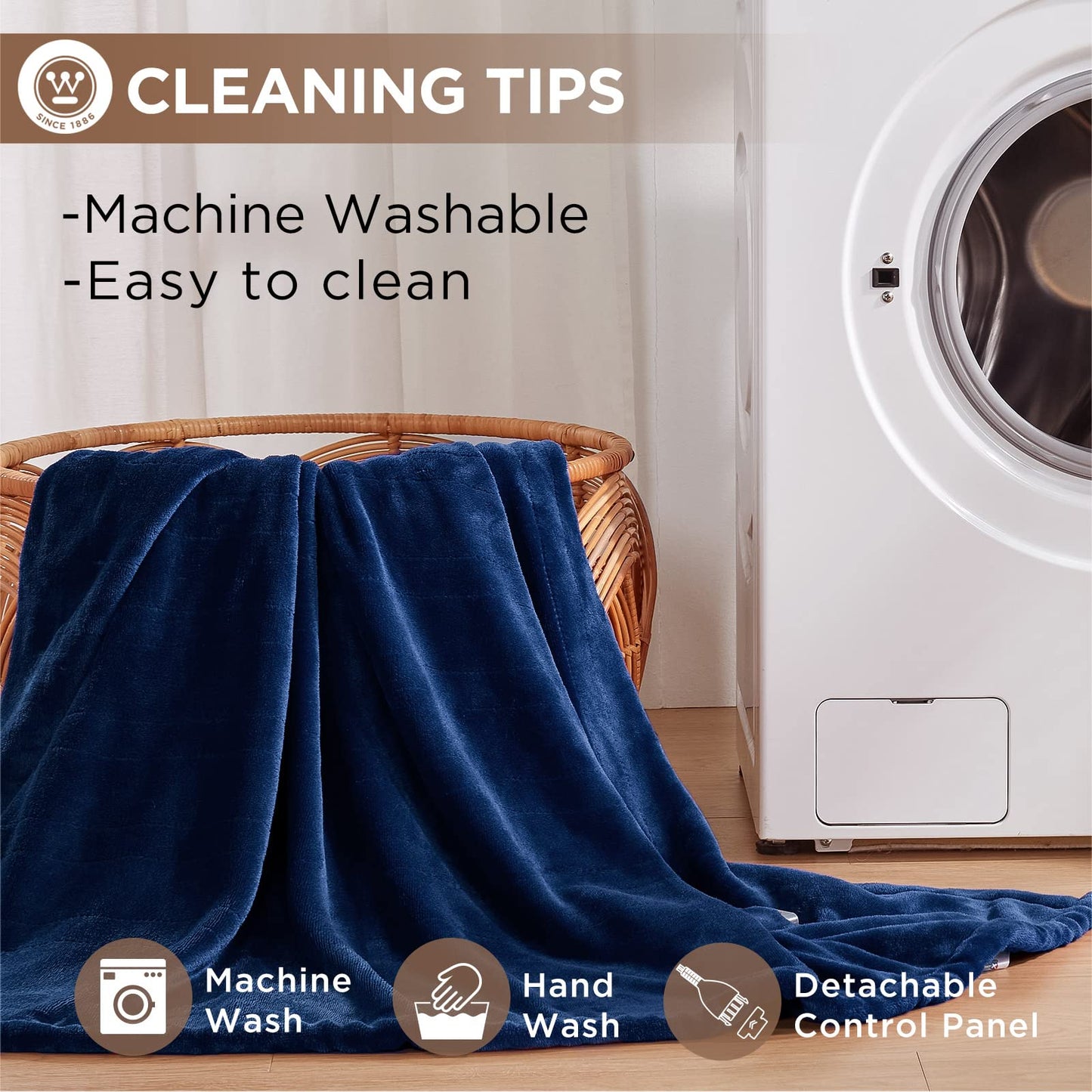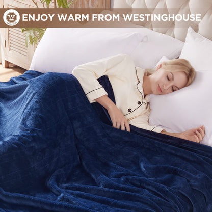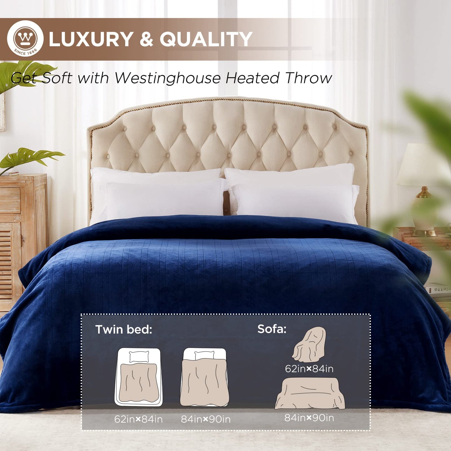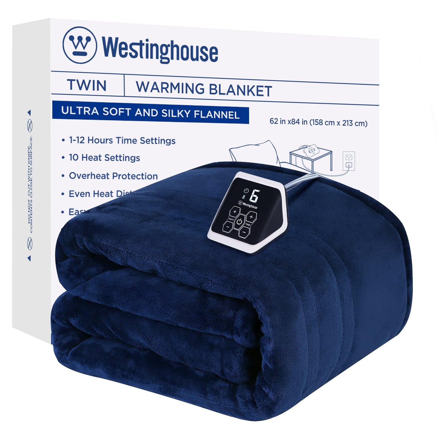 Westinghouse Heated Blanket Twin Size, Electric Heating Blanket with 10 Heating Levels, 1-12 Hours Auto Shut Off, Fast Heating Warming Blanket, Machine Washable (Twin, 62x84 Inches, Navy Blue)