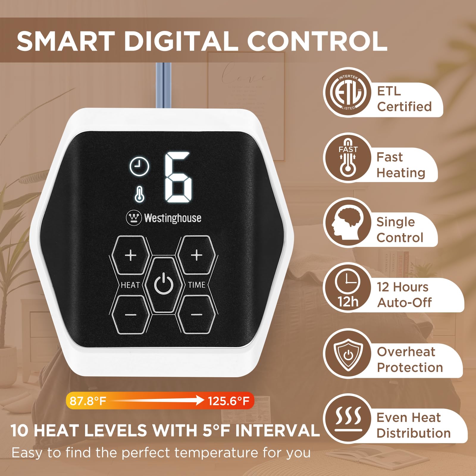- 【INTELLIGENT SINGLE CONTROL & OVERHEATING PROTECTION】 Westinghouse heated blanket supports 20-minute warm-up, help to quickly start the heating process, so you don't have to wait too long to lie under a warm quilt. 1-12 hours automatic shutdown, overheating protection and other functions, let you use it more confidently. 10 heating settings, the temperature can be adjusted freely. The length of the power cord is 72 + 156 inches