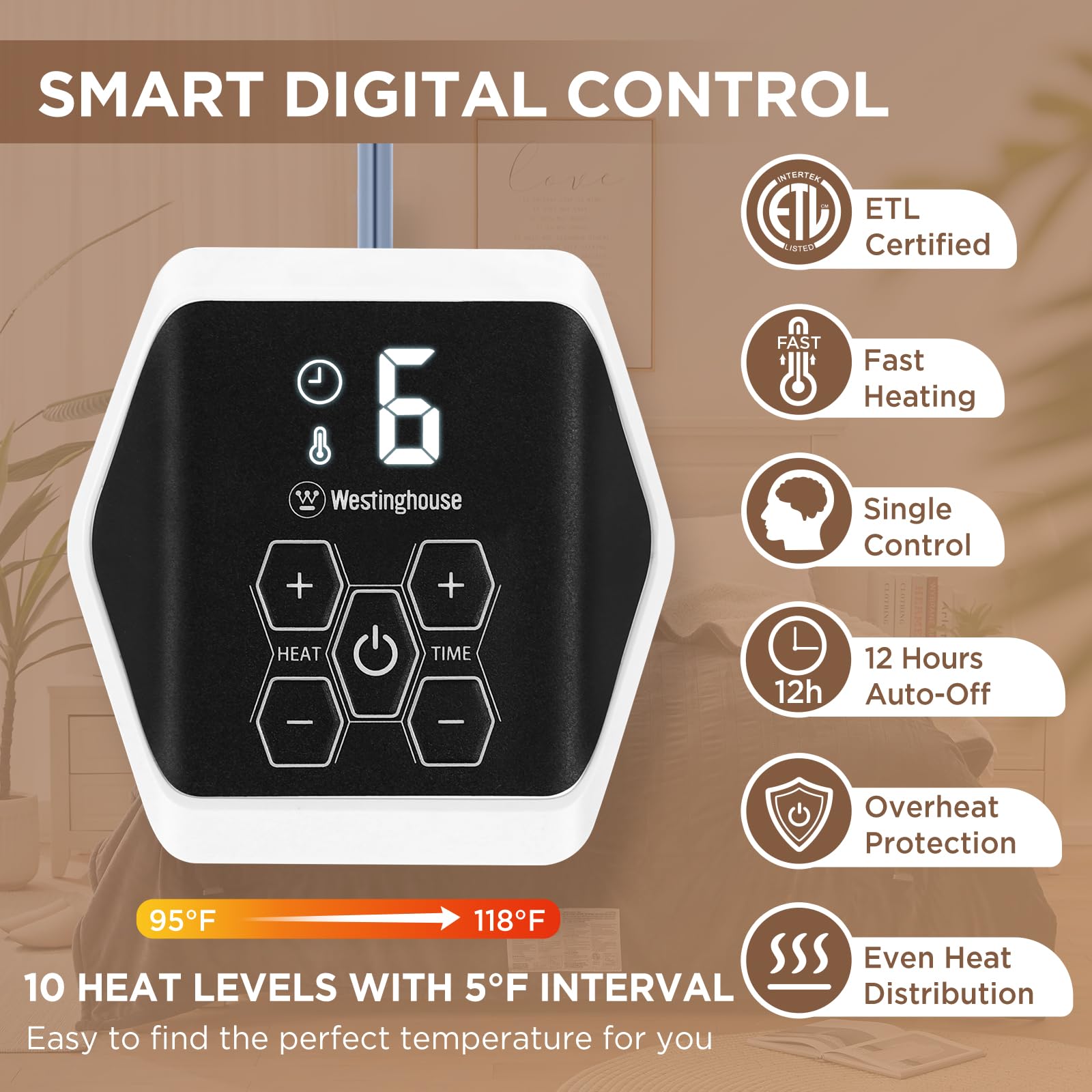 - 【INTELLIGENT SINGLE CONTROL & OVERHEATING PROTECTION】 Westinghouse heated blanket supports 20-minute warm-up, help to quickly start the heating process, so you don't have to wait too long to lie under a warm quilt. 12-hour automatic shutdown, overheating protection and other functions, let you use it more confidently. 10 heating settings, the temperature can be adjusted freely