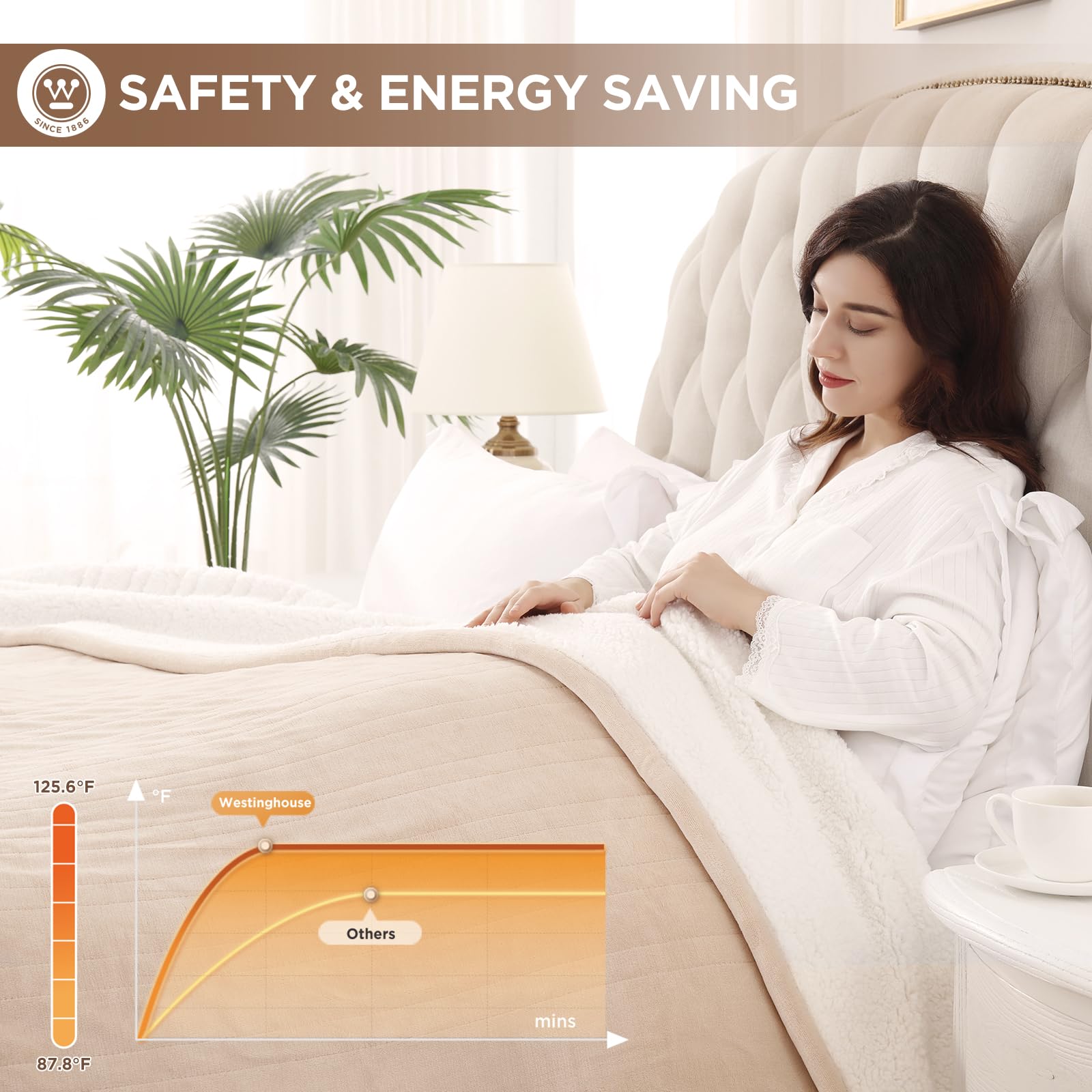 - 【PREMIUM MATERIAL】 Westinghouse electric blanket is made of 200GSM flannel and 200GSM white sherpa, which is super soft, comfortable, skin-friendly and breathable, healthy, and can be directly in contact with the skin. The inner heating line is evenly distributed to avoid local overheating, allowing you to use it with peace of mind