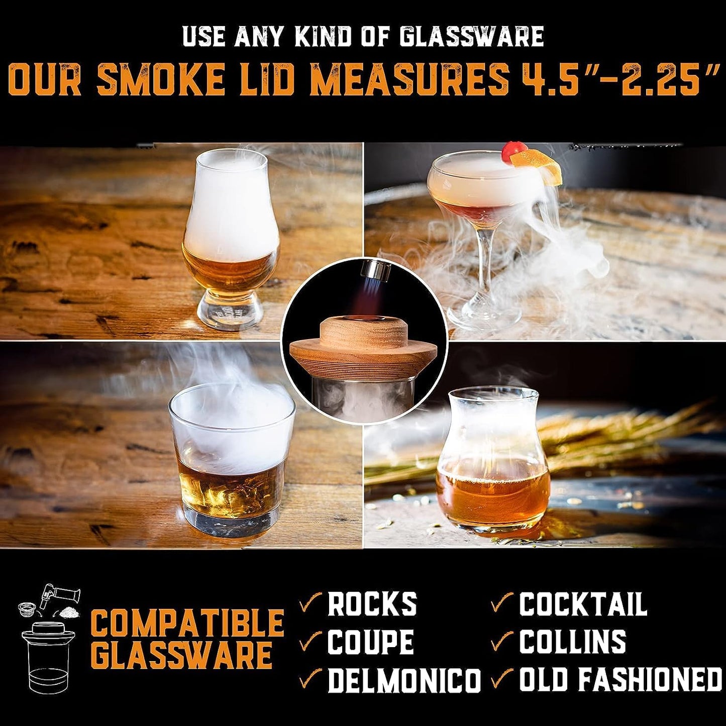 - Whiskey Gifts for Men - Innovative Patent-Pending Design - Experience superior quality with our patent-pending design (29/832,869) that swiftly infuses whiskey with rich smoke in seconds. Made from 100% oak, the Smoke Lid features a tapered bottom to fit various cocktail glasses, including rocks, Glencairn, coupe, and pint. This whiskey smoker kit ensures top performance and speed in delivering the perfect smoked cocktail.