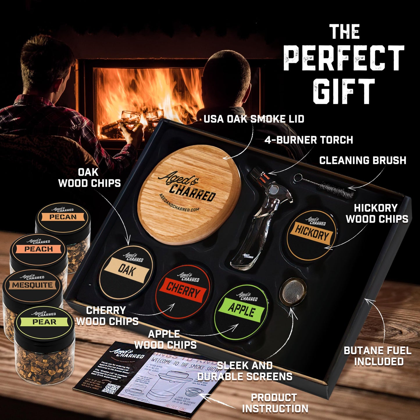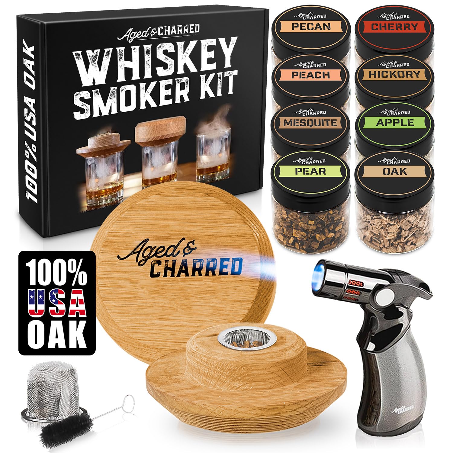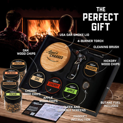 - Complete Whiskey Infusion Kit with Convenient Extras - Offering unmatched ease of use and completeness, this drink smoker kit includes an oak smoker, a refillable premium torch, a container of wood chips, and three stainless steel screens, all packaged in a stylish gift box. Designed for high performance, this cocktail smoker kit with torch allows you to create smoked old fashioned cocktails and other delightful drinks effortlessly.