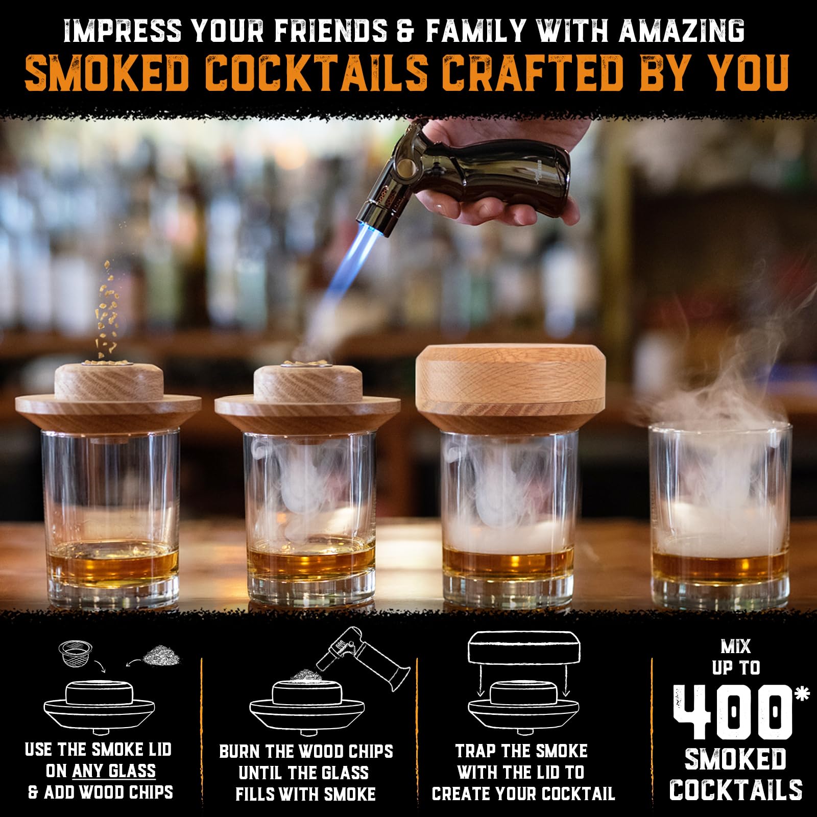 - High-Performance Four-Burner Torch - Our compact four-burner torch delivers high heat instantly to the wood chips, ensuring a quick and efficient smoking process. This whiskey smoker kit with torch is perfect for creating exceptional smoked cocktails with top-notch performance. *Packaging may vary