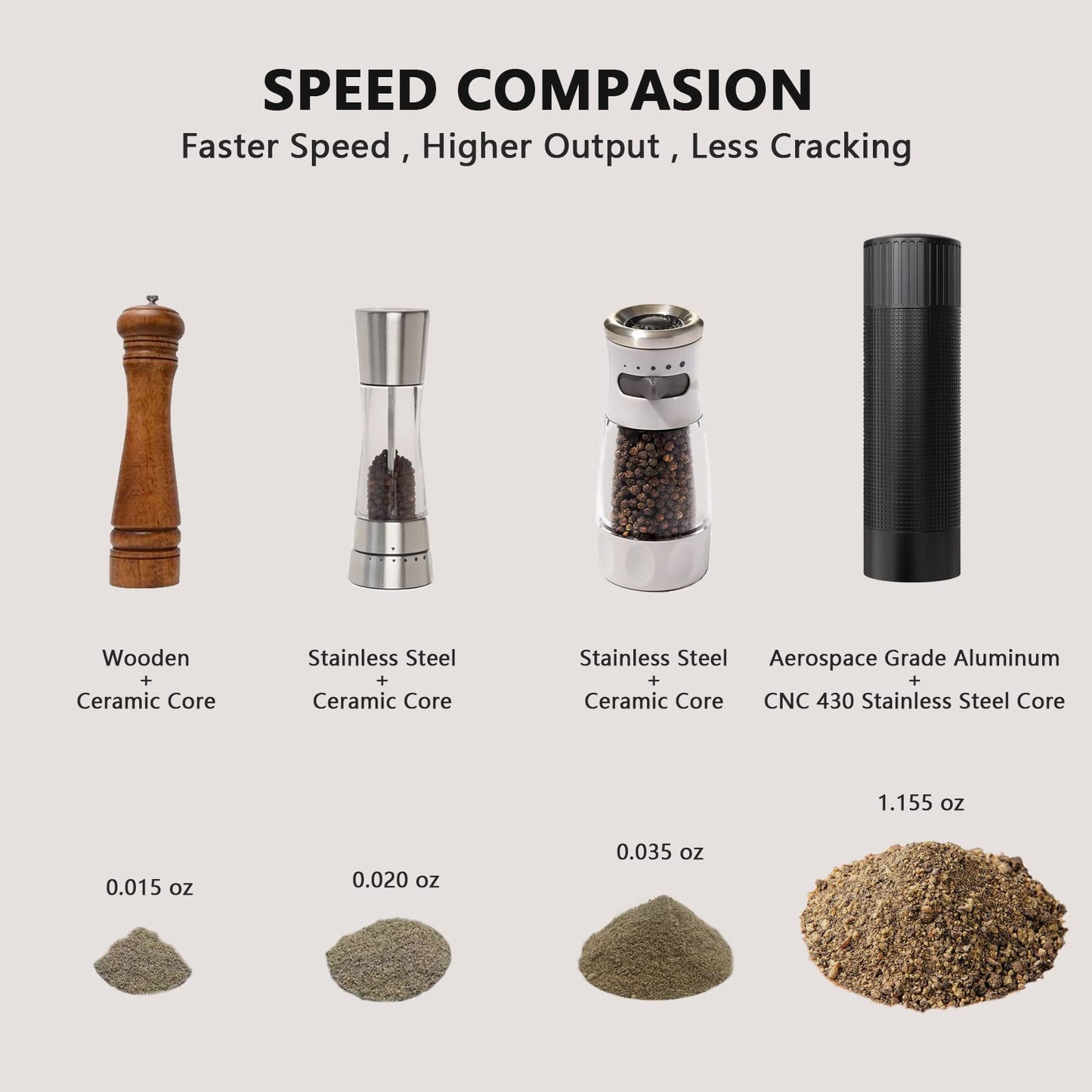 - 【Faster Speed&Higher Output】This professional grade powerful pepper grinder make up To 10X faster speed and 5-10X higher output than top rated pepper mills,pepper your steak in 5 Cranks instead of 50;Stop the never-ending sloge,the pepper mill can comfortably fit a decent scoop of peppercorns (approximately 55 grams) ,expertly constructed to produce pepper like never before: quickly, consistently, and perfectly.specially useful in a busy restaurant where chefs need to season many dishes quickly.