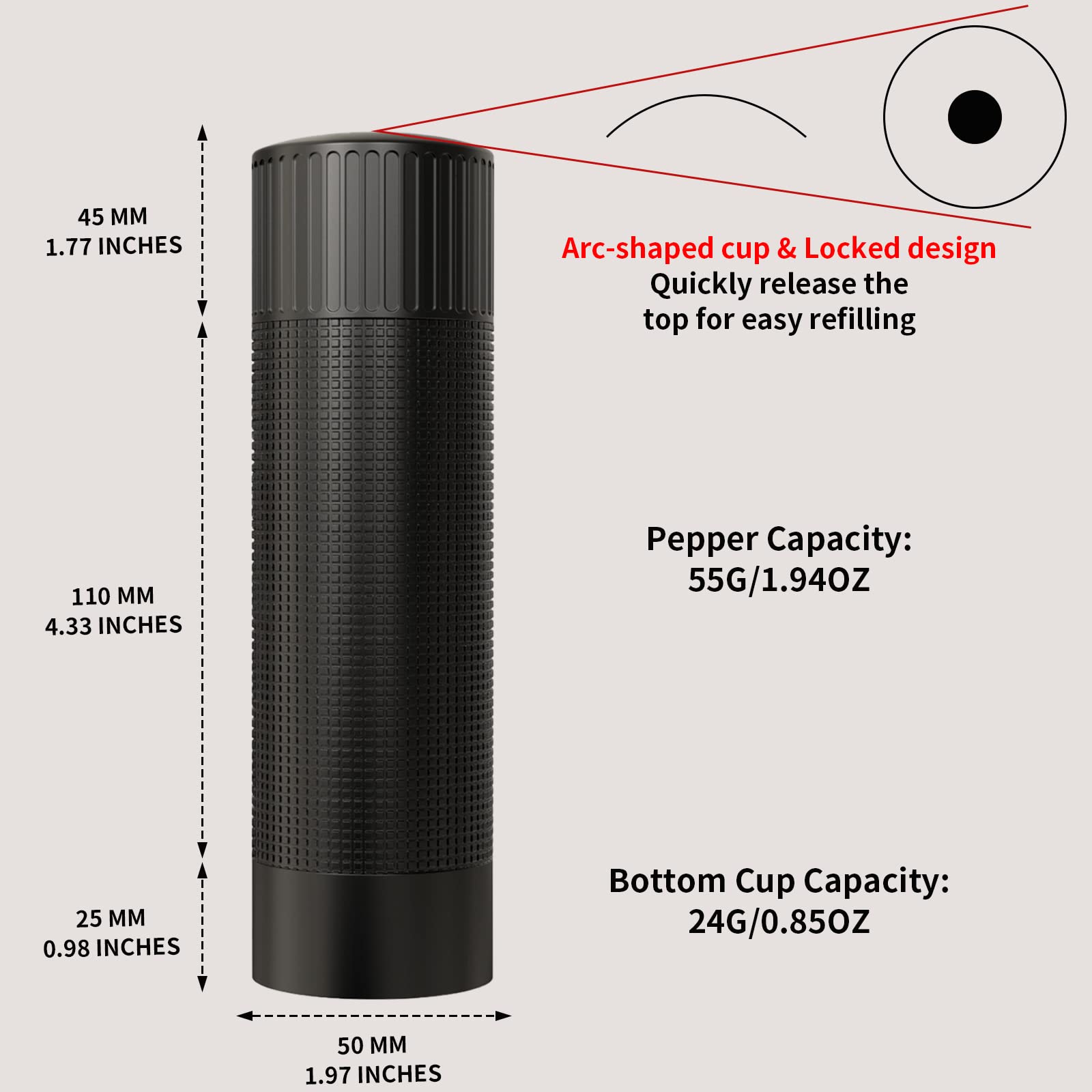 - 【Quick Release Top&Base Cup Storage】The spice grinder with top button lock design,just pressing the button gently to remove and secure the lid ,which make refill more easily and safety, avoiding the trouble of rotation. The bottom storage tank can be used to store pepper and help keep the pepper fresh and the kitchen clean;