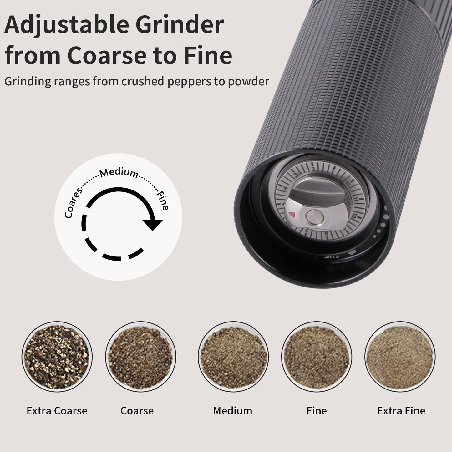 - 【Adjustable Coarseness 】Super wide grind range from cracked pepper to powder,simply turn the knob on the bottom of each manual pepper grinder to set the desired coarseness of pepper or spice. Rotate clockwise to fine particles and counterclockwise to grind coarser particles. The pepper grinder can make pepper range from the coarsest 6 to finest 60+,coarse granules and ultra-fine powder can meet your different needs just like seared meats, rubs, and salads, etc.