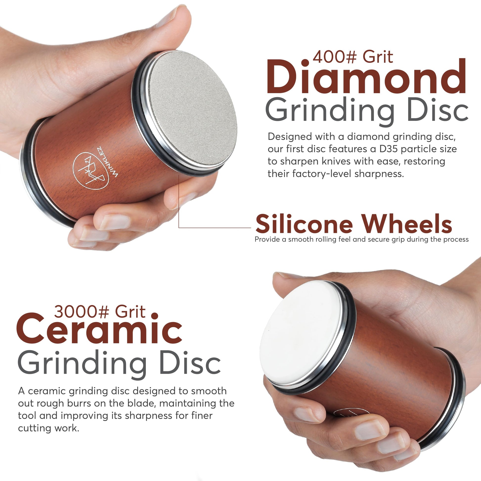 - 🗡️【DIAMOND & CERAMIC SHARPENING】The knife sharpening process starts with #400 diamond disc that removes the first layer of your sharpener knife edge, followed by a smooth #3000 ceramic disc for polishing, offering precise results and long-lasting sharpness. This kitchen knife sharpener delivers professional-quality performance.