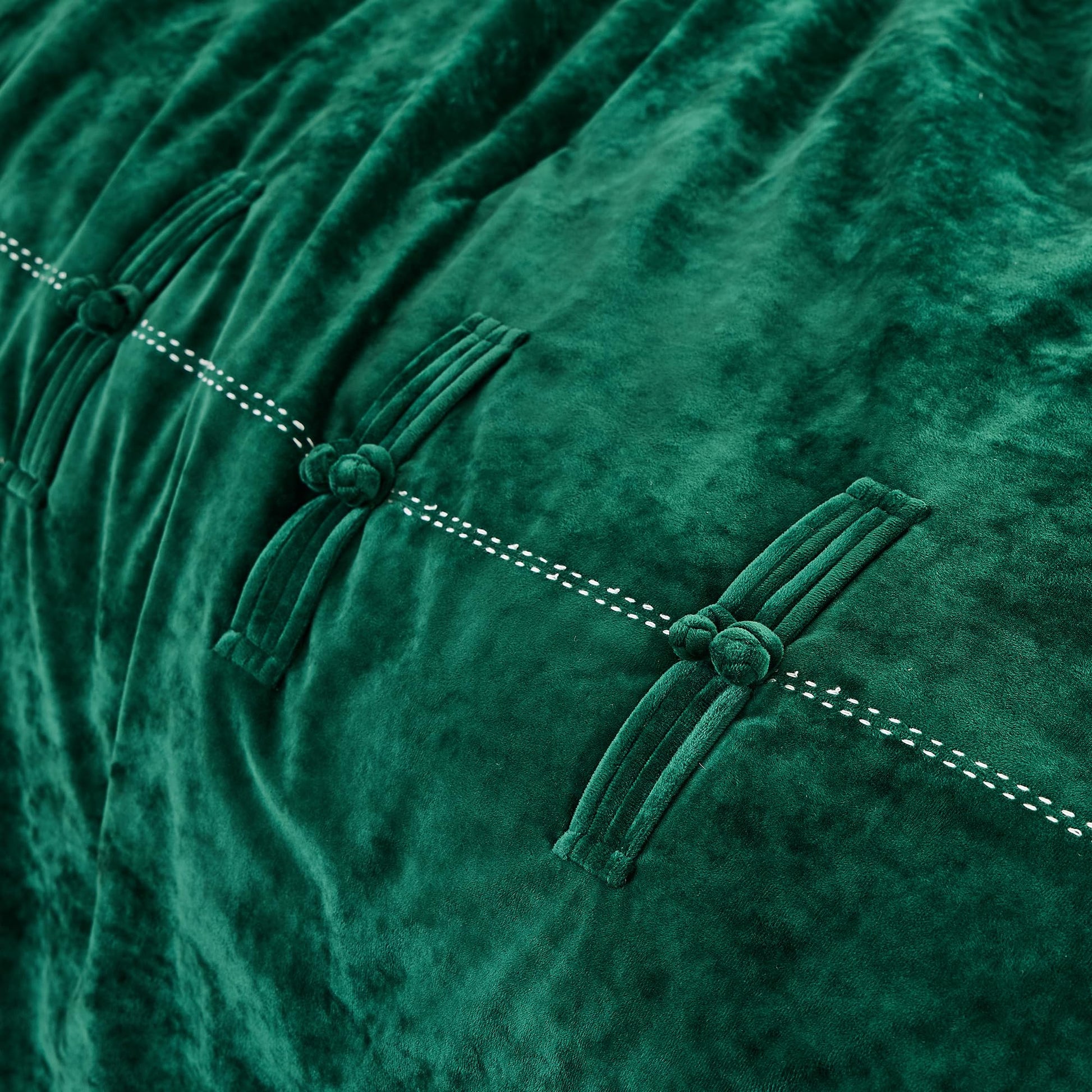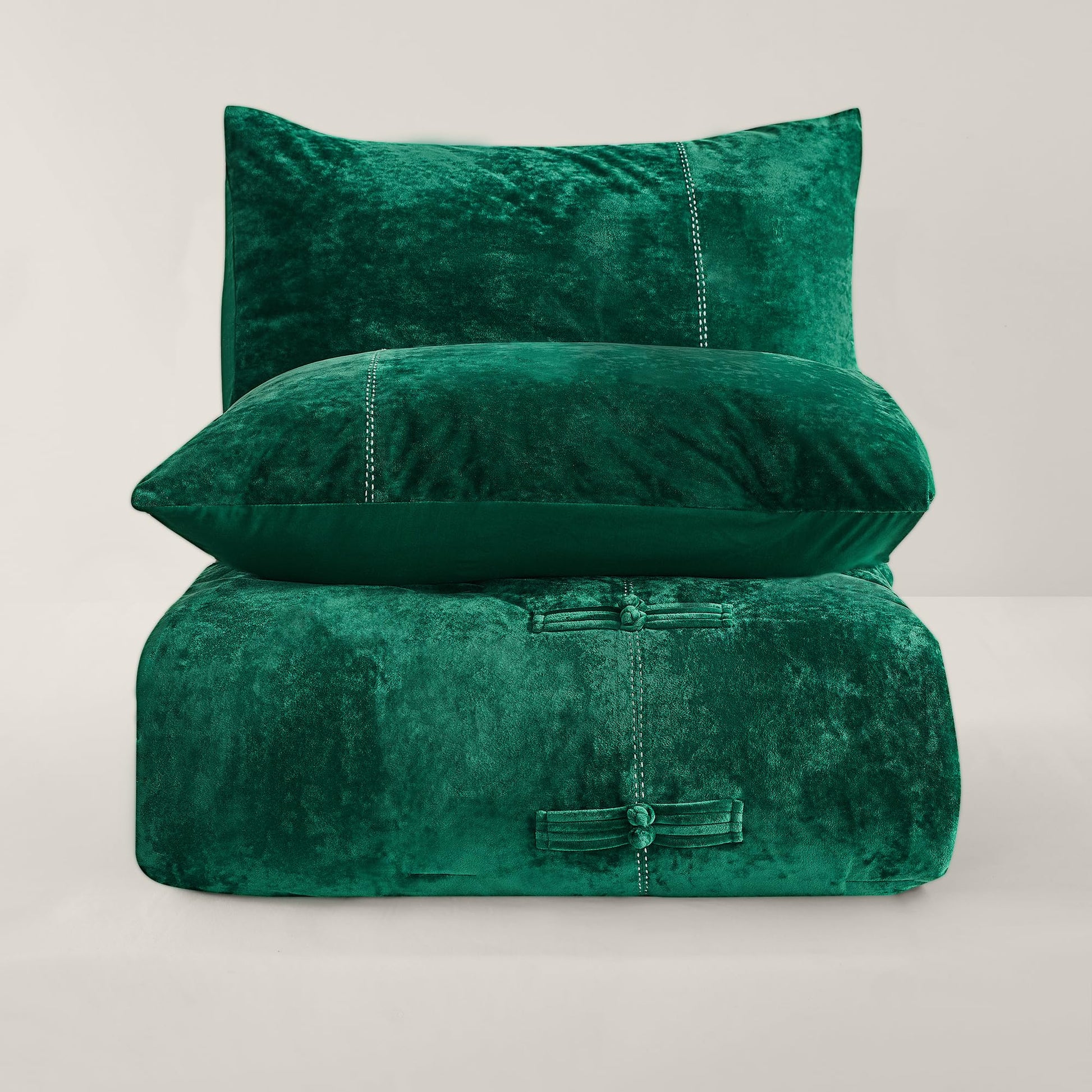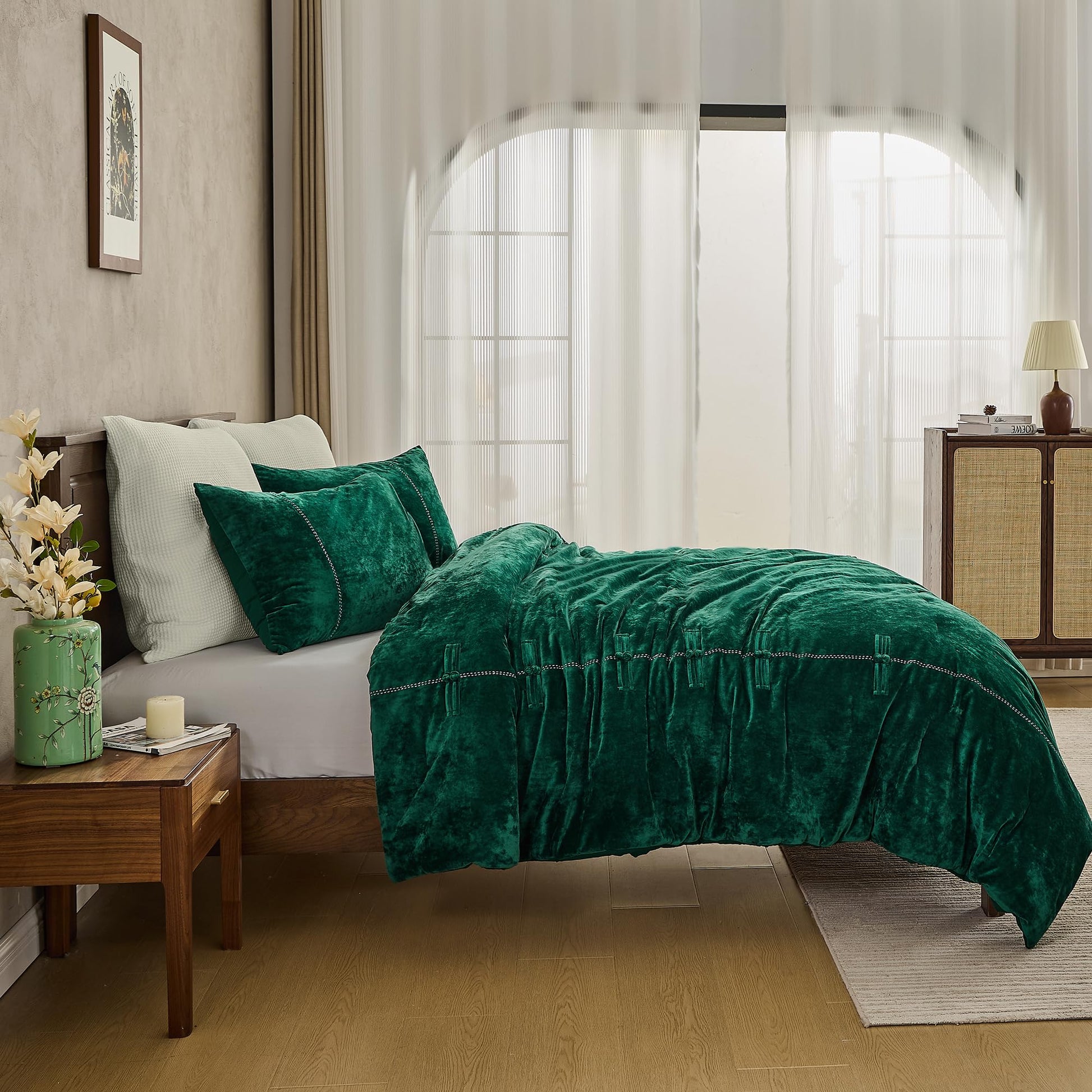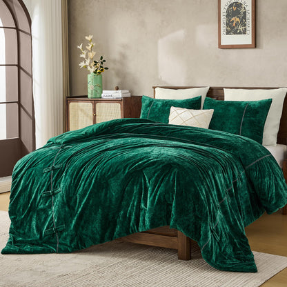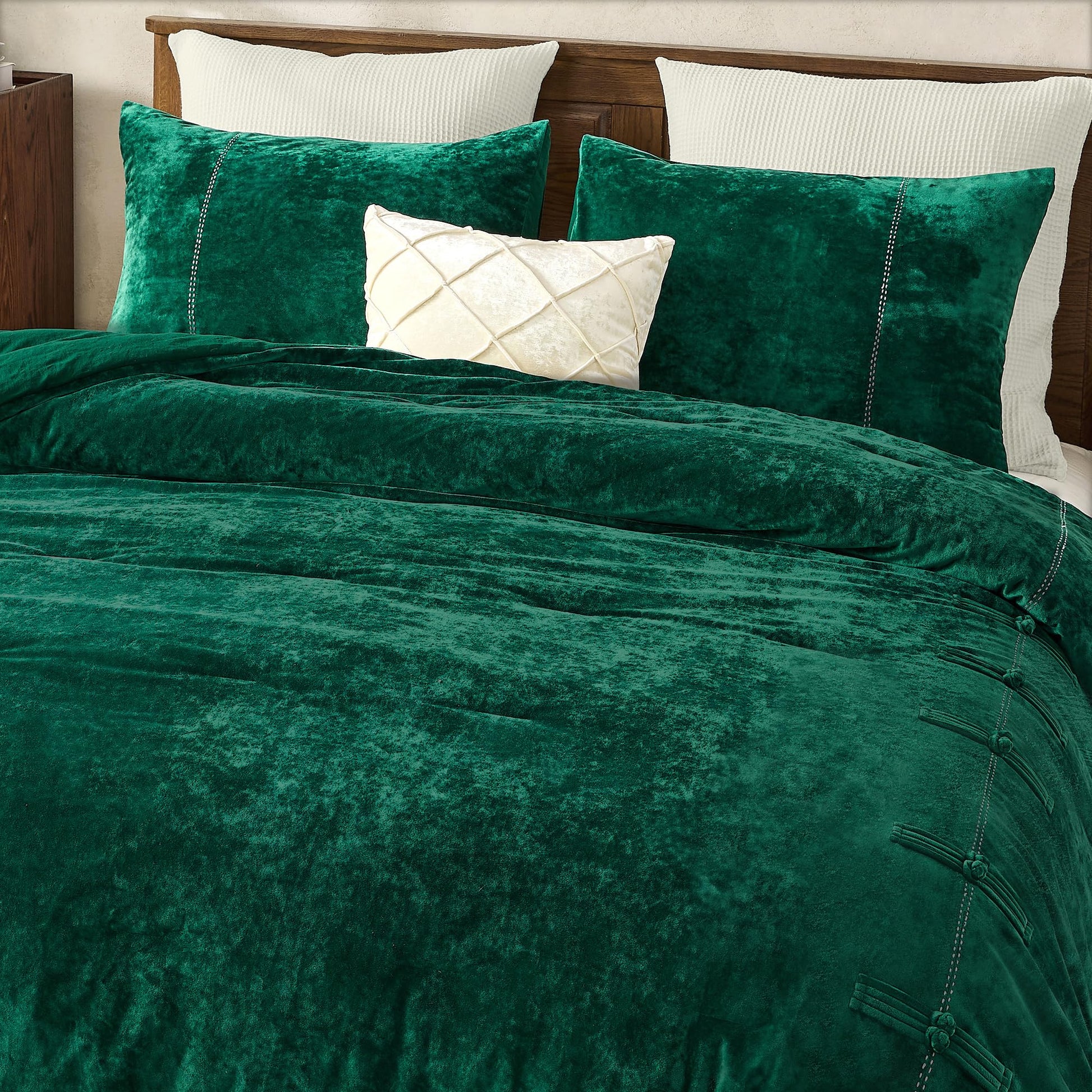 Wonderful Luxury Velvet King Size Comforter Set- Chinese Knot Button Handcrafted Accent Lightweight Reversible Cozy, Cotton Feel, Fluffy Christmas Bedding All Season(Forest Green)