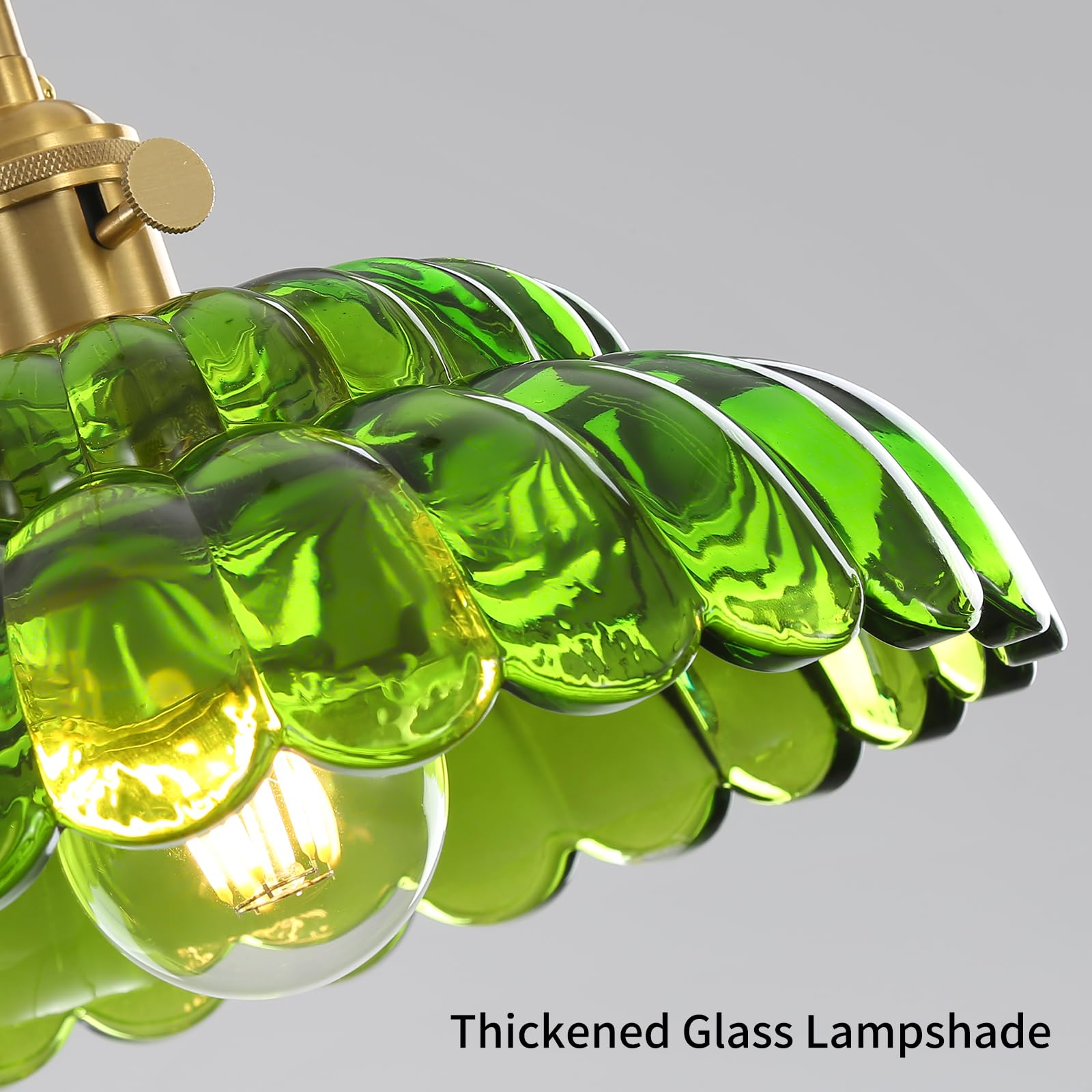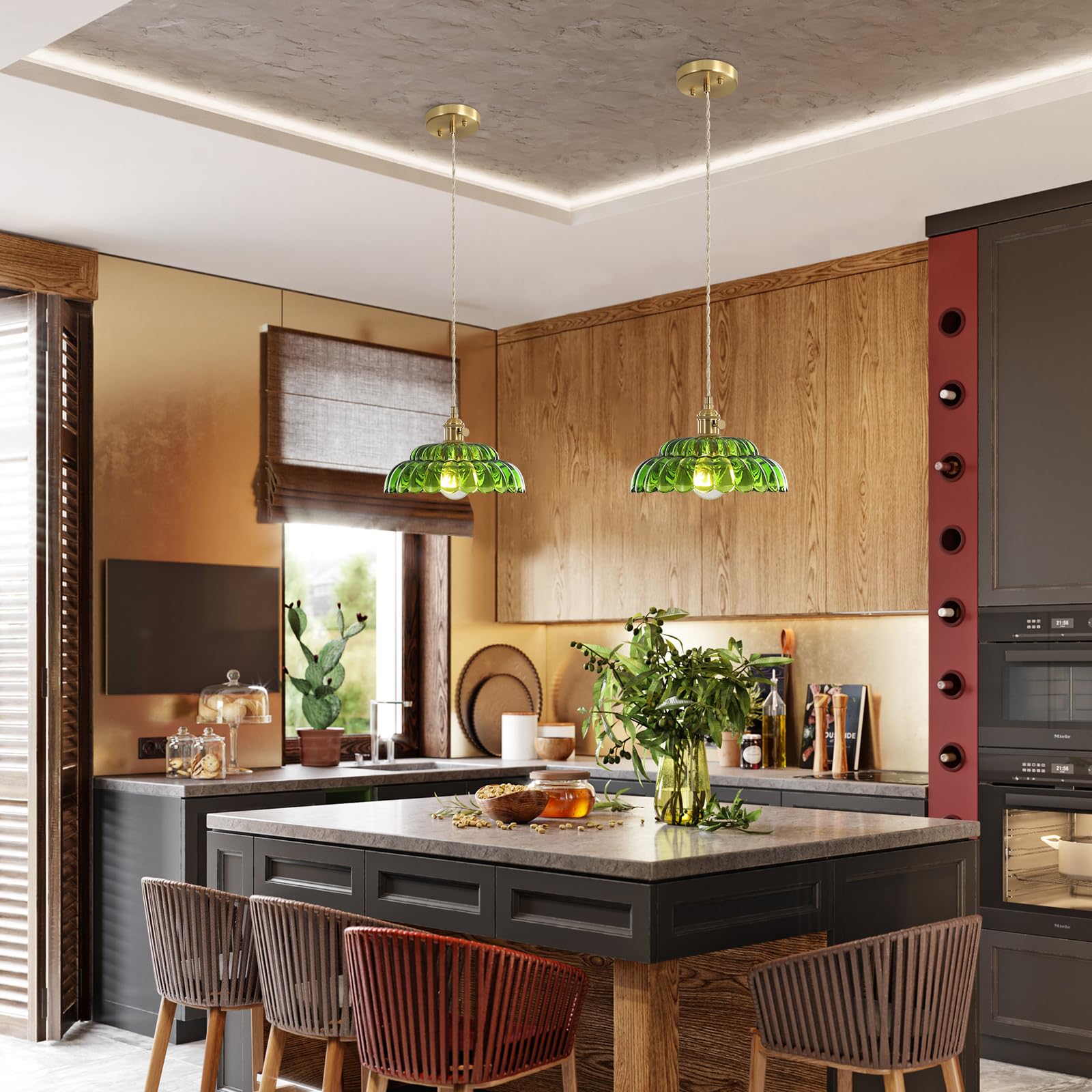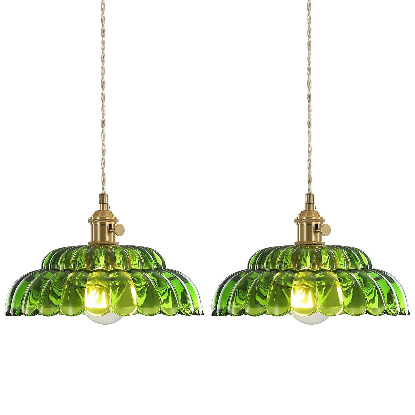 XIYOUVE 2 Pack Pendant Light with Lotus Green Glass Lampshade, Brass Vintage Pendant Light, Adjustable Hanging Light, for Kitchen Island Dining Room Hallway, E26 Socket (Bulbs Not Included)