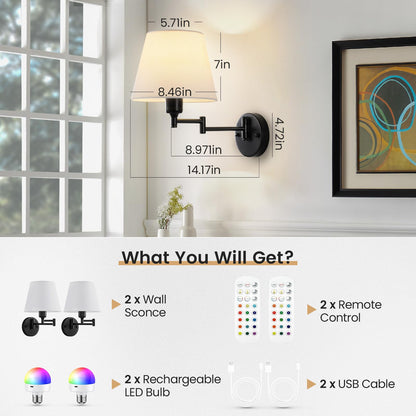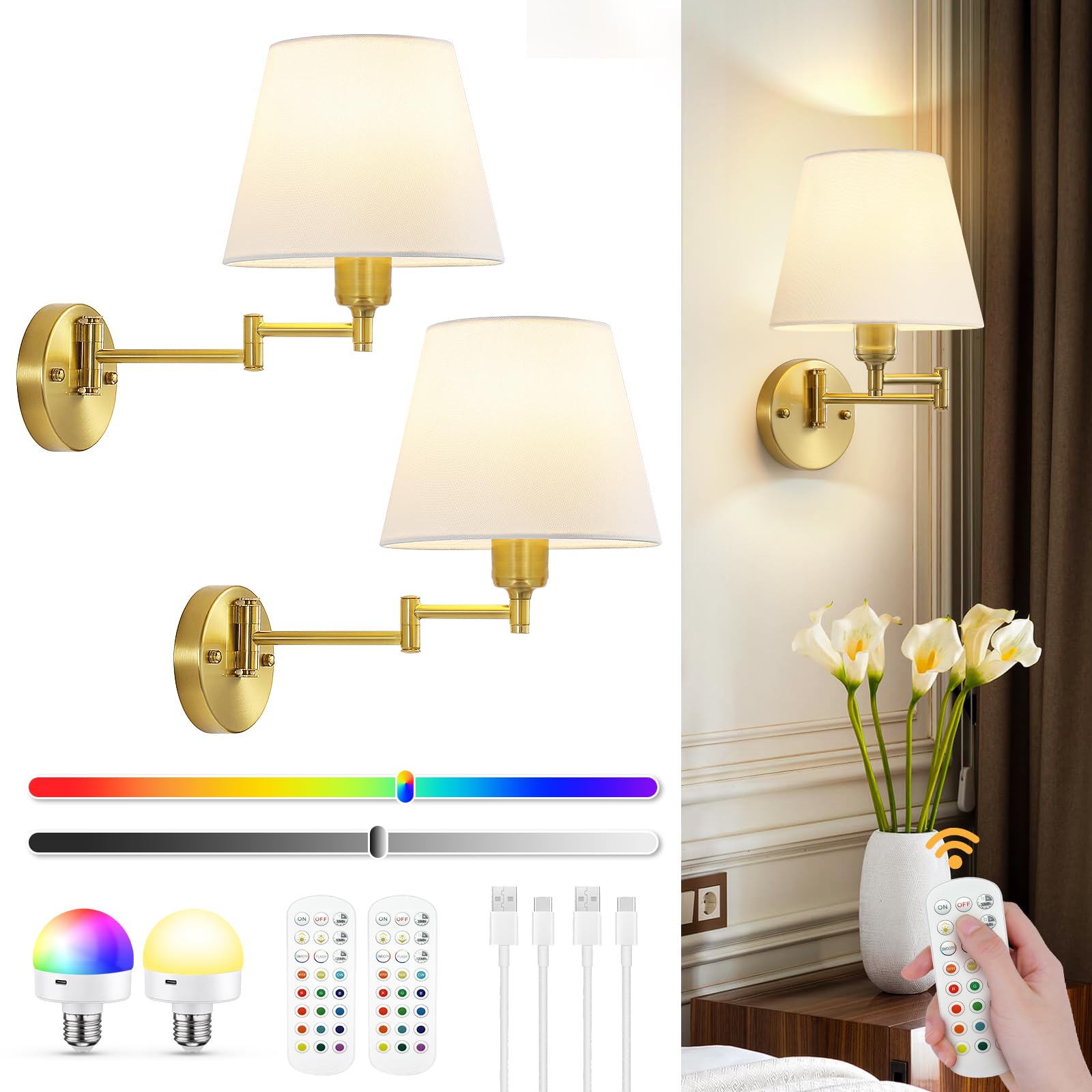 XMLHL Battery Operated Wall Sconce Set of 2, Wireless Rechargeable Wall Lights Sconce Set of Two, Adjustable Swing Arm Wall Lamps with Remotes Dimmable RGB Bulbs, Wall Decor for Home Bedroom (Brass)