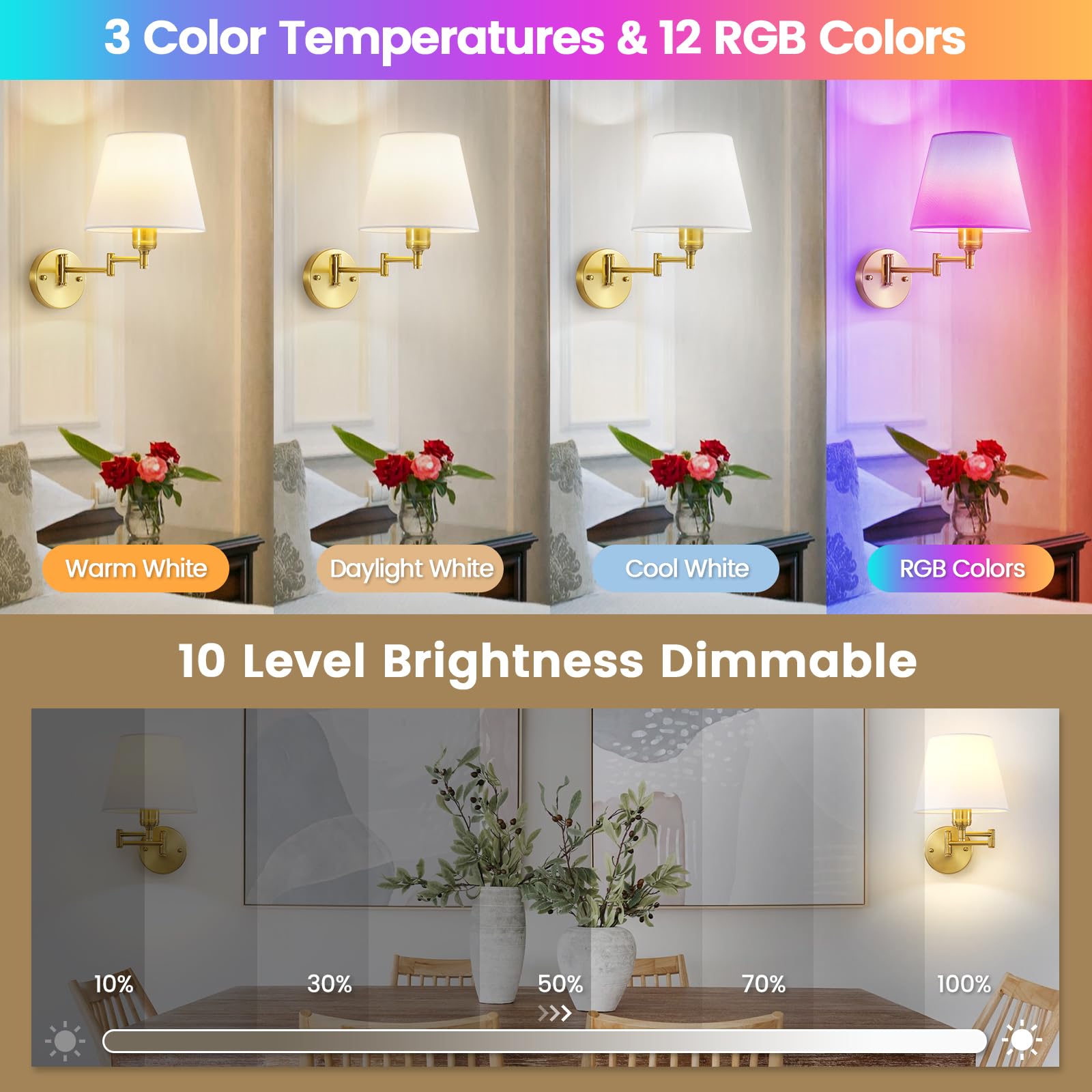 - 【Dimmable Wall sconce set of 2】The wall lamp includes Two remote control that provide various features such as adjustable brightness (10-100%), customizable color temperature (warm white, neutral white, daylight), 12 RGB colors options, 3 timer settings (30, 60, 120 minutes), and a convenient one-touch night light function.