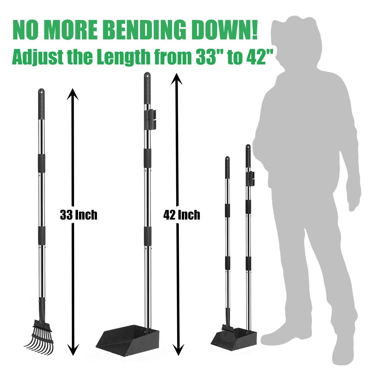 - 【No Bending Over Pooper Scooper】 Featuring six stainless steel tubes, you can easily adjust the length from 33" to 42". (Three lengths of tubes can be interchanged on the tray and rake, and you can adjust the length according to your needs.) Its ergonomic design ensures comfort, eliminating back and leg fatigue. The flexible pronged rake glides effortlessly through grass, concrete, and kennels, making pet waste cleanup quicker and simpler. Crafted from rust-proof powder-coated steel, the smooth scoop and rake surfaces rinse clean with ease. Enjoy a stress-free cleanup experience today!