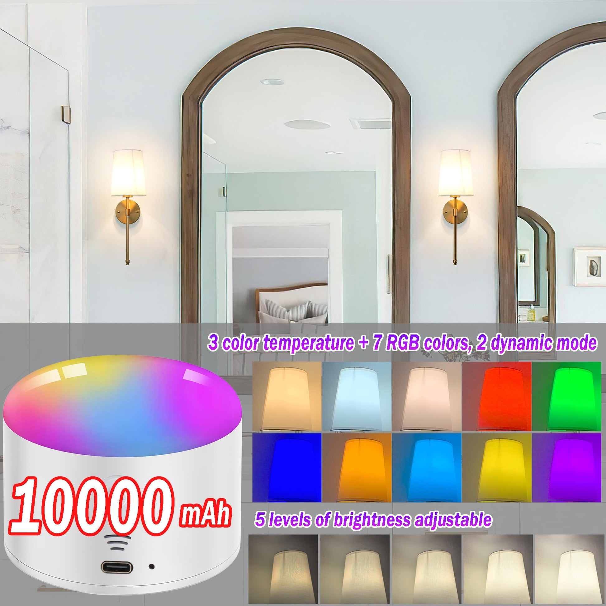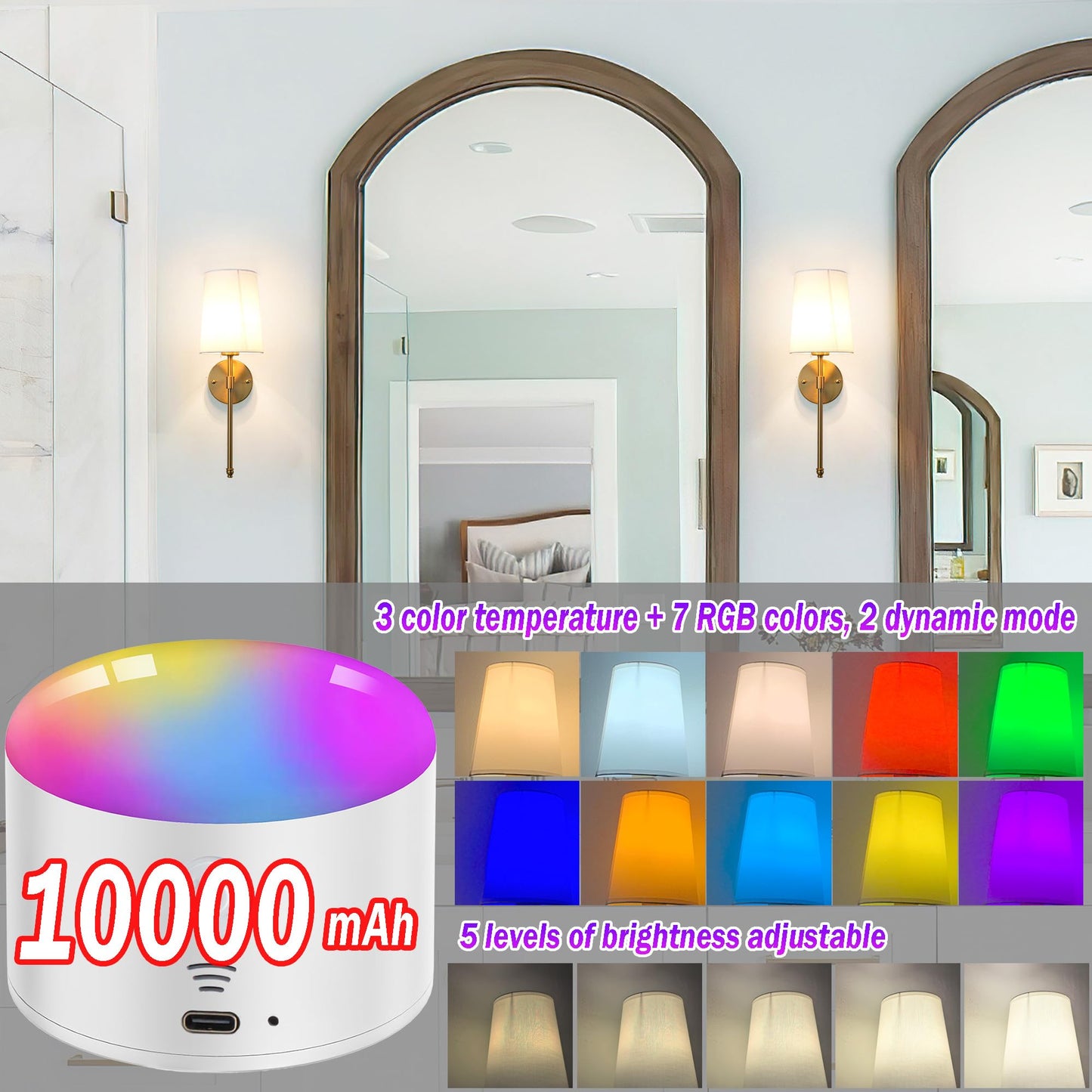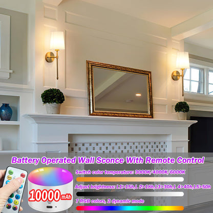 - Upgrade RGB ambient lighting: Our Battery powered wall lights let you customize your lighting like a painter with their palette. Each wall sconce offers 7 RGB colors and 2 dynamic modes, as well as 3 color temperatures to choose from,you can choose your favorite colors for different occasions and moods. Rechargeable, includes USB charging cable (Type-C).