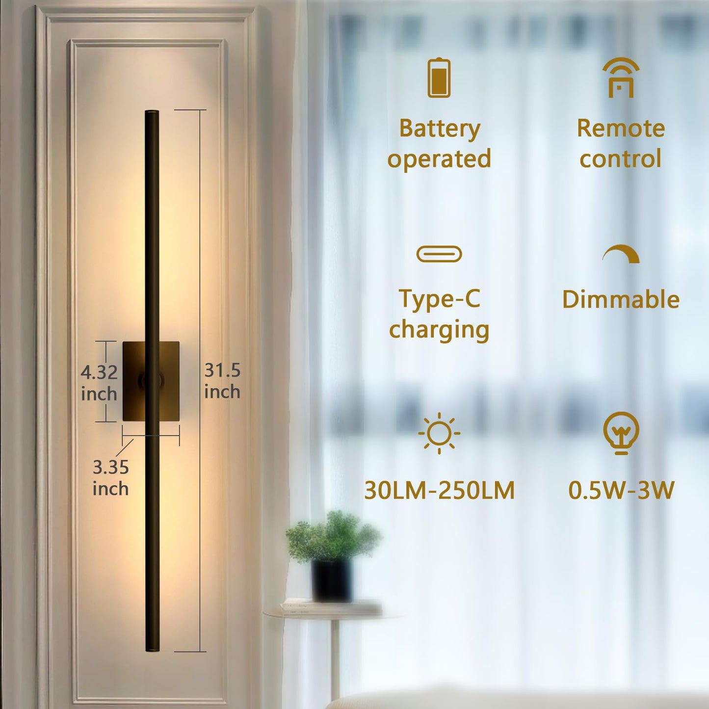 - 【Wireless Wall Lights with Remote Control】Long wall sconce easily manage all settings via the included remote control. Children can dim or turn off the wall sconces themselves when they're tired from playing and go to bed to rest, allowing you to focus on your work with peace of mind
