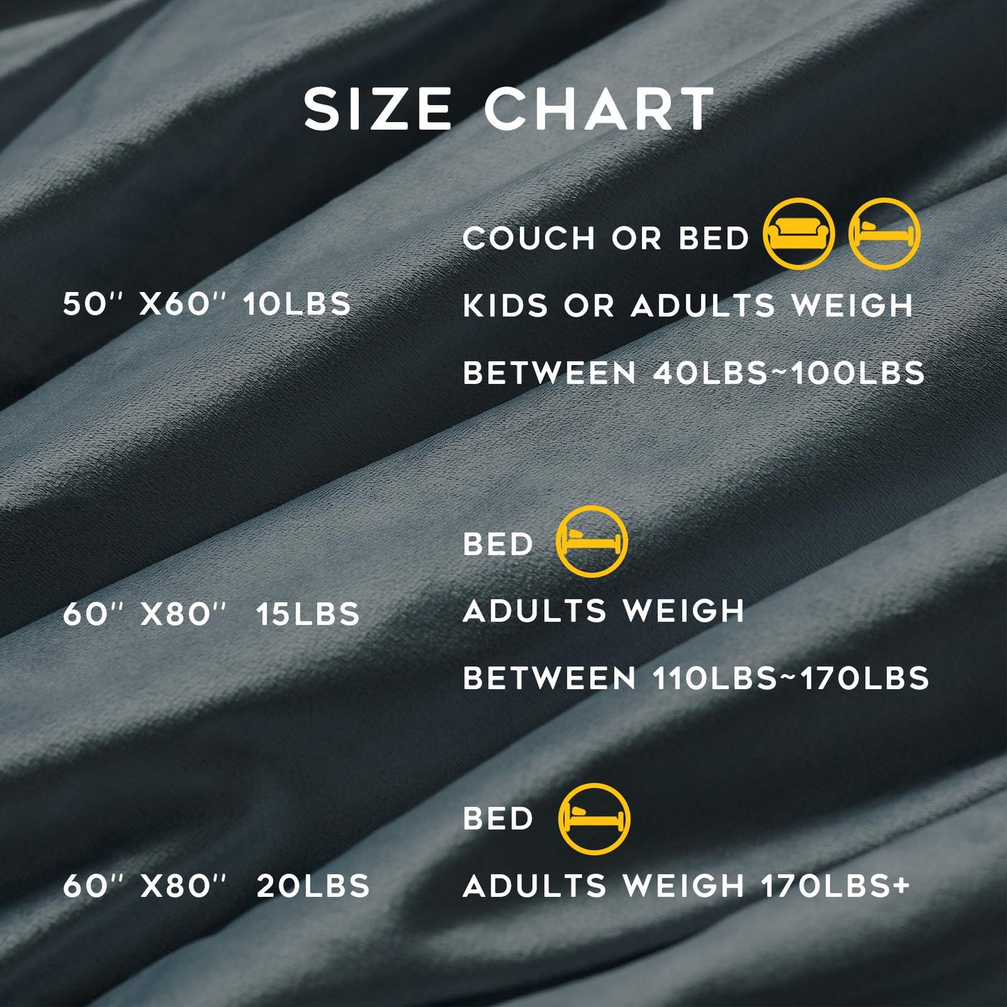 - Three sizes available: 50''x60'' 10lbs for kids use or throw blanket on couch , 60''x80'' 15lbs blanket for body weight about 110- 170 lbs person, 60''x80'' 20lbs blanket for body weight above 170 lbs person