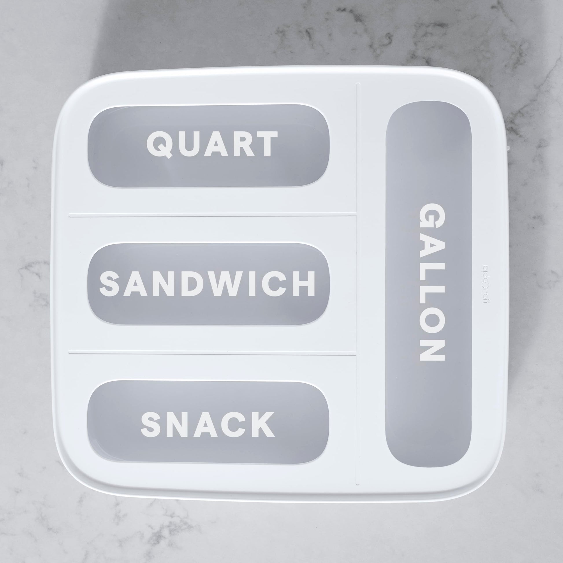 Details: StoraBag™ Food Bag Dispenser keeps all your food storage bags in one tidy spot. Individual compartments organize plastic bags in a drawer while reducing box clutter. Four high-capacity compartments fit bulk boxes of bags so you don’t have to refill as often. Bright, removable labels let you see what you have and find the baggie size you need. It’s easy to pull a bag from the wide slots while a removable top lid helps you reload quick. With supplies organized in a drawer dispenser, meal prep is in the bag.