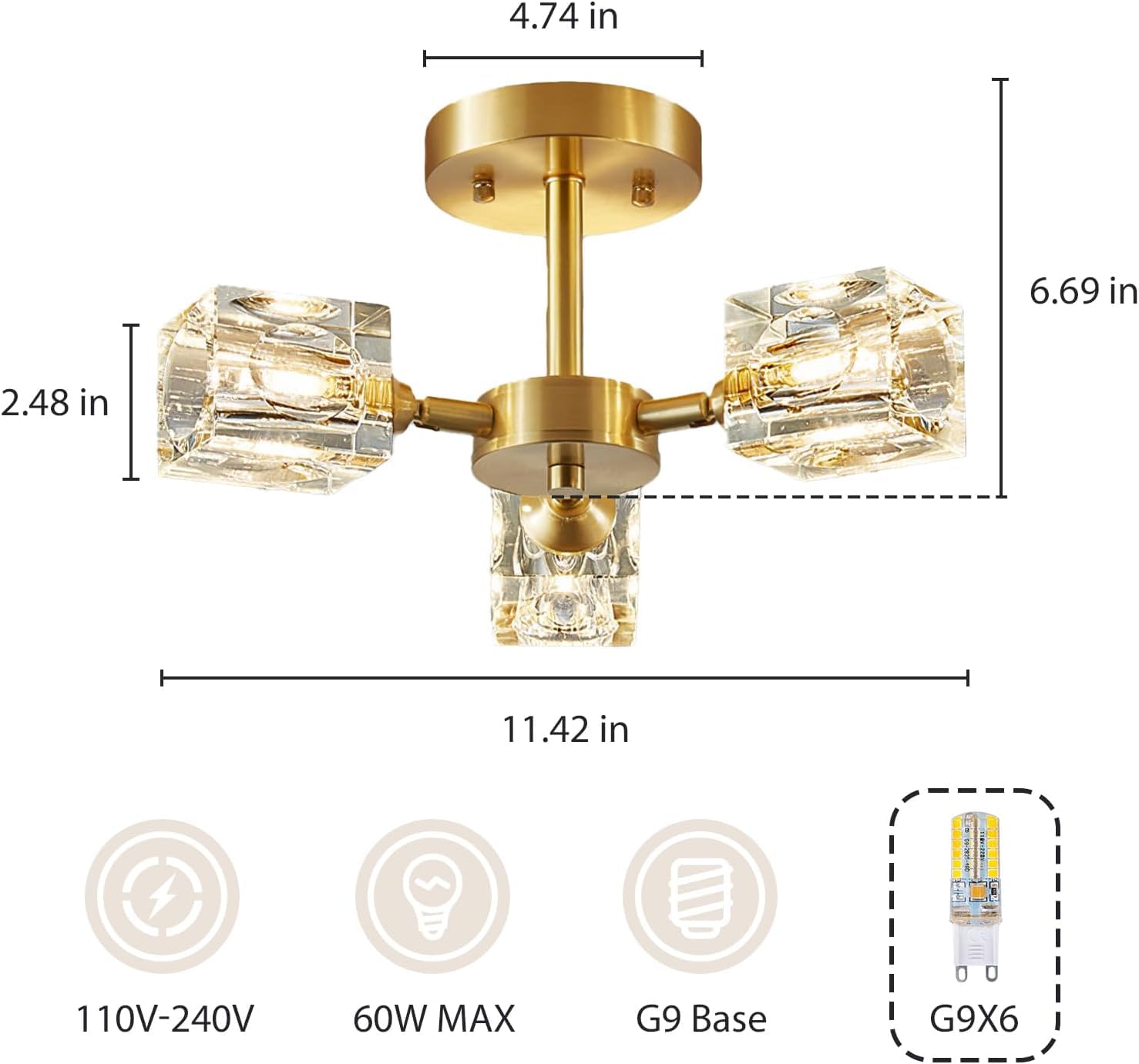 Yunnix Semi Flush Mount Ceiling Light 3 Lights Crystal Chandeliers Gold Ceiling Light Modern Ceiling Light for Bedroom Kitchen Hallway Bathroom Entryway Dining Room Living Room