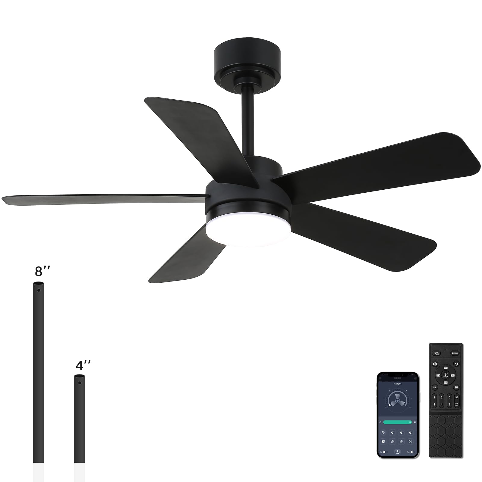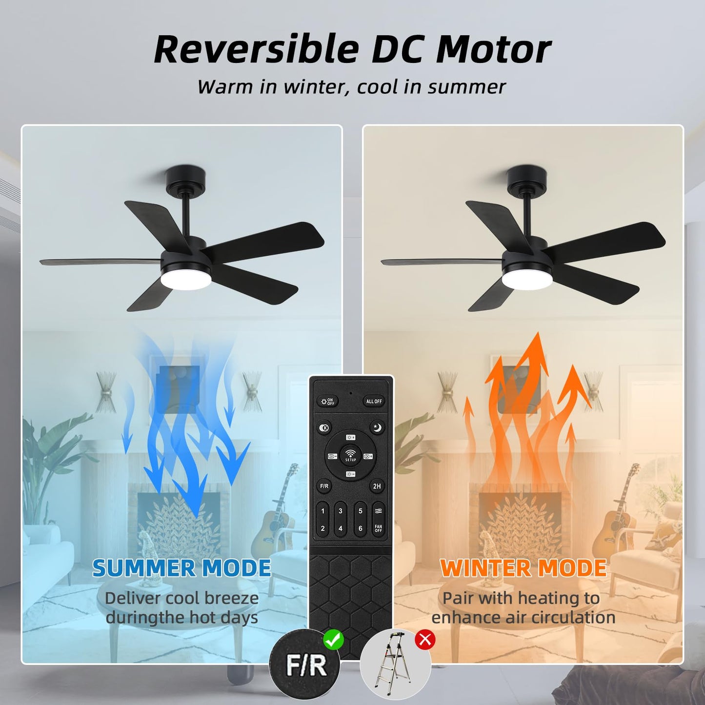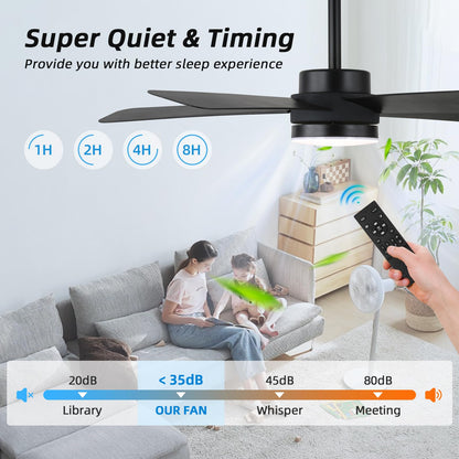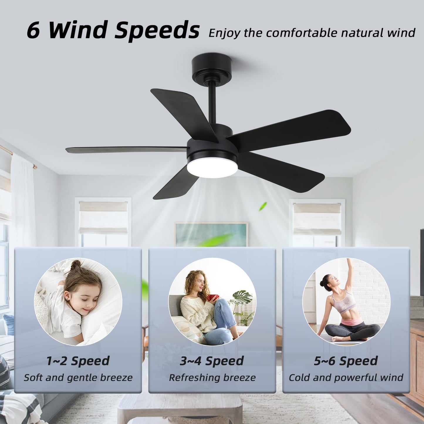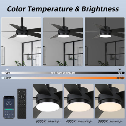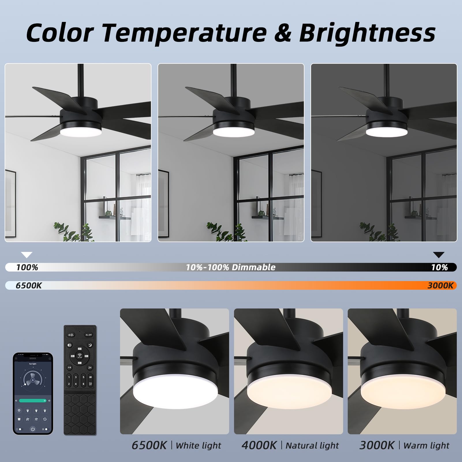 - 【Remote Control & APP Control】Smart ceiling fan supports both APP and remote control, Effortlessly control your matte black ceiling fan with a dedicated app, including 1-6 speed adjustments, timing settings(1/2/4/8H),Dimmable,3000K-6500K Color Temperature Selectable,10%-100% Smooth Dimming to adjust the brightness .The fan and light can be turned on separately. (Tips: After fixed, the remote control can be used as a wall switch)
